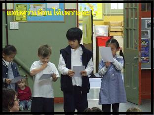 ...อย่างที่จั่วหัวค่ะ ....ผ่านไป เกือบ 4 เดือน ภาษาอังกฤษของพี่เคนดีขึ้นเรื่อยๆ สำเนียงไม่ออกไทยเลย ดีกว่าแม่เค้าเยอะเลย เพราะทุกวันครูจะให้เอาหนังสือกลับมาอ่านเล่นๆกับผู้ปกครองวันละ 3 เล่ม เวลาเราพูดคำว่า had ออกเสียงเป็น " แฮ๊ด" เค้าฟังไม่ออก พูดไปพูดมา เคน บอกว่า " แฮ่ด...ไม่ใช่แฮ๊ด ครับ หม่าม๊า ...มิน่าเคนฟังไม่ออก ...แป่ว "