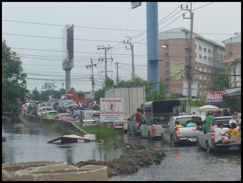 ใจตุ่มๆต่อมๆมาตลอดไม่เป็นอันทำงาน .. ดูข่าวติดตาม . จนกระทั่งน้ำมาประชิดที่นวนครและแจ้งว่า "เอาอยู่" ไม่ถึง 2 วันน้ำเข้าเต็มพื้นที่อพยพโกลาหล .... เอาแล้วไง . ภายในคืนนั้นมวลน้ำได้ไหลบ่าเข้ามา ที่ อ.บางบัวทอง / อ.ไทรน้อย ฯ และเพิ่มระดับน้ำขึ้นเรื่อยๆ ... จนเรารู้สึกกลัวไปหมด ภาวสนาให้บ้านที่เพิ่งซื้อรอด .. หรือเสียหายที่สุด .. และวันที่ 20 ตุลาคม เวลาประมาณ 09.00 น. .. เราก็ต้องตกใจ + น้ำตาไหลเมื่ออกจากบ้านจะมาทำงานคนเต็มไปหมดนั่นคือ .. หมู่บ้านบัวทอง จมน้ำไปแล้วทางสัญจรไปมาโกลาหลอย่างมาก T.T