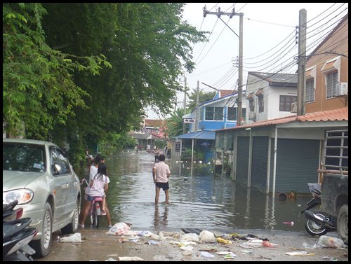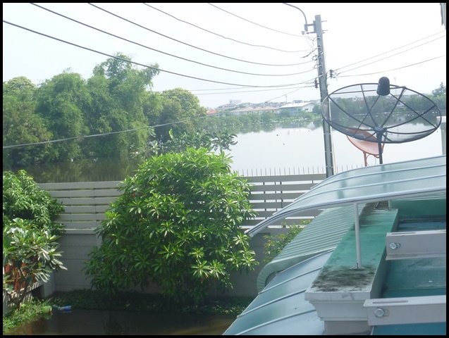 และจากพื้นที่สีเขียวที่เคยมอง ... ก็กลายเป็นเวิ้งน้ำไปหมด .. พร้อมทั้งน้ำในโครงการผุดจากท่อเอ่อเข้าท่วมถนน T.T