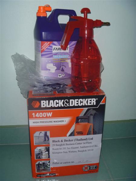 - และขอเสนออุปกรณ์ทำความสะอาดตู้ปลา .. คือ ทยอยซื้อเข้าไปไว้บางส่วน แล้วก็ยกเข้าไปวันนี้อีกบางส่วน .. 1. น้ำยา EM อันนี้ฉีดใส่รอบแรกเลยแล้วทิ้งไว้ 2. น้ำยาทำความสะอาดคราบฝังลึกฟอสเซนถังม่วง .. 3. แปรงขัดทั้งด้ามยาว ด้ามสั้น สก๊อตไบ (ซื้อไว้เป็นโหล) 4. ถุงมือยางเหมือนของหมอ (อันนี้ได้มาเป็นกล่องจากคุณแฟนเข้า รพ.เป็น 2009 คุณหมอเลยให้มายังเหลือเยอะ) 5. แมสปิดปากจมูก .. แนะนำควรใส่เป็นอย่างยิ่งค่ะ 6. แว่นตากรอง (เหมือนช่างเชื่อมเหล็ก) เตรียมไว้แต่จริงๆไม่ได้ใส่ 7. เครื่องฉีดน้ำแรงดันสูง .. อันนี้แนะนำทุ่นแรงไปได้เยอะ แต่สีตามผนังบ้านถลอกหลุดแน่นอน .. แต่แค่เอาสก๊อตไบรท์ขัดก็ร่อนแล้วววว 8. ถุงดำขนาดใหญ่สำหรับใส่ขยะที่จะทิ้งมัดปากรอเจ้าหน้าที่มาเก็บไปทำลายค่ะ 9. รองเท้าบูท ... เตรียมไว้แต่ไม่ได้ใส่ .. ลุยแล้วเช็ดด้วยแอลกอฮอล์แทน .. แหะๆๆๆๆ  10. เปิดเพลงบรรเลงจะได้ไม่เครียดกันนะคะ ..