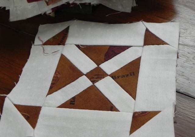ผ้าลายกาแฟสีน้ำตาลชิ้นนี้ เป็นผ้าอเมริกันชิ้นแรกที่ซื้อมา มีขนาดหนึ่งส่วนสี่ เขามีสีคู่กันเป็นสีครีม สวยดี ใช้มาตั้งนานแล้วไม่หมดสักที เป็นผ้าที่นุ่ม เนื้อแน่นและควิลท์สนุก ลายนี้ นับว่าเป็นลายที่ค่อนข้างง่าย ไม่ซับซ้อนทั้งเวลาต่อผ้าและล้มตะเข็บ ชิ้นที่ตัดก็ไม่เล็กเกินกว่าสายตาของสว.จะมองเห็นได้