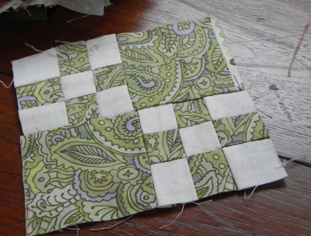 ปกติ ไม่ค่อยจะมีผ้าสีเขียวในกรุ แต่นี้เป็นหนึ่งในสีเขียวที่เป็นเศษผ้าเหลือจากทำงานชิ้นที่เรียนกับครูนิกกี้ ครูเลือกให้ ถ้าเลือกเองคงไม่ได้สีเขียว เป็นสีน้ำตาลหรือสีครีมเสมอ ลายนี้ง่ายสุดๆ แค่ต่อผ้าสี่เหลี่ยม มุมชนมุม ล้มตะเข็บธรรมดา