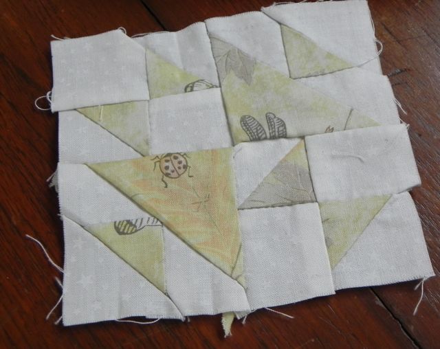 ผ้าช้ินนี้ก็เช่นเดียวกับเจ้าสีเขียวข้างบน มาพร้อมกันในงานชิ้นเดียวกัน เอาของเหลือมาเล่น ผ้าออกจะนุ่มและบางมากๆ ในลายผ้า จะมีแมลงเต่าทองและแมงปอแอบอยู่ ชิ้นสามเหลี่ยมข้างล่างดูไม่แหลม แต่ของจริงแหลมนะ ที่ไม่แหลมเพราะยังไม่ได้รีด ผ้านูนโค้งขึ้นมาน่ะ เวลาดูบล๊อกนี้แล้วคิดถึงปลาเทวดา