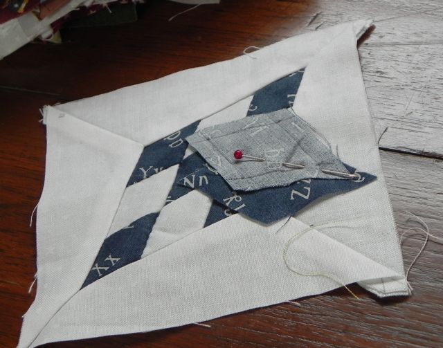 ผ้าสีีน้ำเงินลายตัวอักษรของมาสเตอร์มาซาโกะนี้ก็สวยมากๆ บล๊อกนี้ก็เท่ห์สุดๆ ตรงที่ต้องทำให้มุมแหลมเปี๊ยบ พอทำเสร็จ เอ แล้วอีกสี่ชิ้นนี่จะทำยังไง รอเอาไปถามครูนิ๊กกี้ดีกว่า ข้างหลังก็ล้มตะเข็บไม่ได้ งงมาก มันยุ่งเหยิงไปหมด
