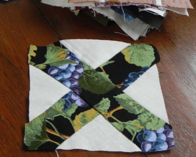 นี่ก็อีกชิ้นที่เป็นผ้าเศษมาจากงานที่เรียนกับครู เป็นผ้าที่ครูช่วยเลือก สีฟ้าก็ไม่ใช่ ไม่รู้ว่าจะเป็นสีอะไรดี ลายเล็กๆจุ๋มจิ๋ม บล๊อกนี้คล้ายๆกับบล๊อกผ้าลายองุ่นข้างล่าง ชะรอย คุณป้าเจนก็มีสภาวะโนไอเดียเหมือนกัน