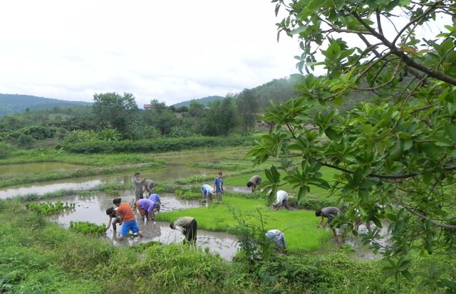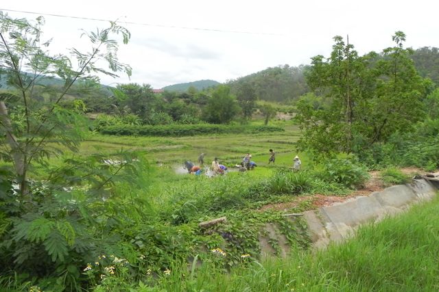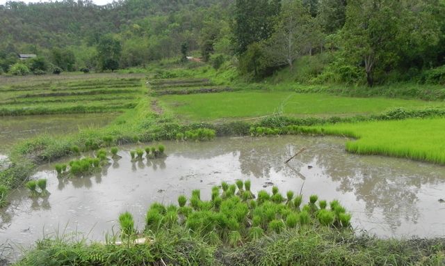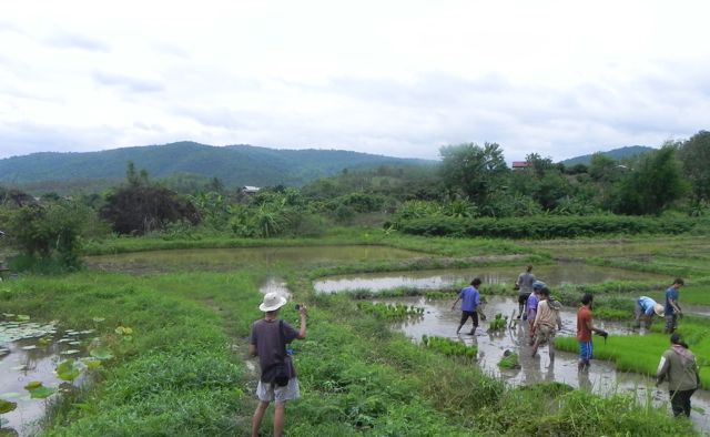ผลงานที่สำเร็จและงานที่ต้องทำต่อหลังจากอาหารกลางวัน ต้นกล้าที่ถูกมัดไว้ มีหน้าตาเหมือนหัวเด็กที่มัดผมจุก..เสียดายที่ไม่ได้อยู่ดำนาต่อ เพราะมีต้องออกไปจัดการเรื่องถมที่และขุดสระ ..