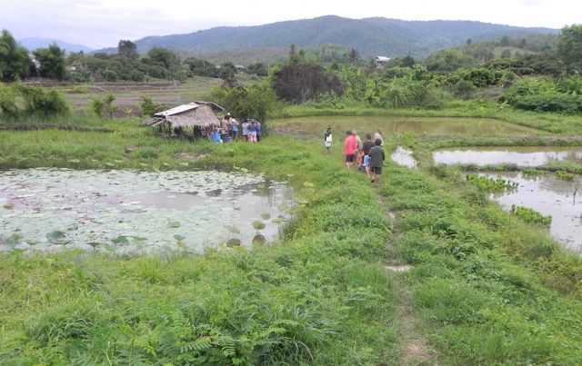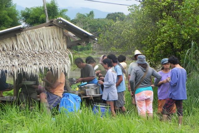 พักเทีี่ยงกองเสบียงเอาอาหารมาส่ง เมนูผัดผักบุ้งที่เก็บไปจากท้องนาแถวๆนี้นี่แหละ มะรุมมะตุ้มกินกันสนุกสนาน ตบท้ายด้วยฝักบัวสดๆ เก็บจากสระบัวใกล้ๆกัน