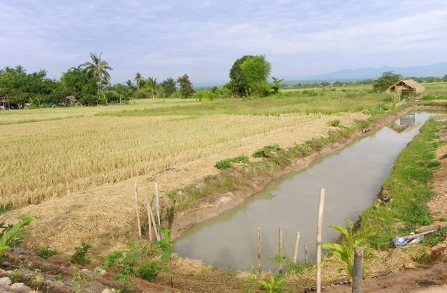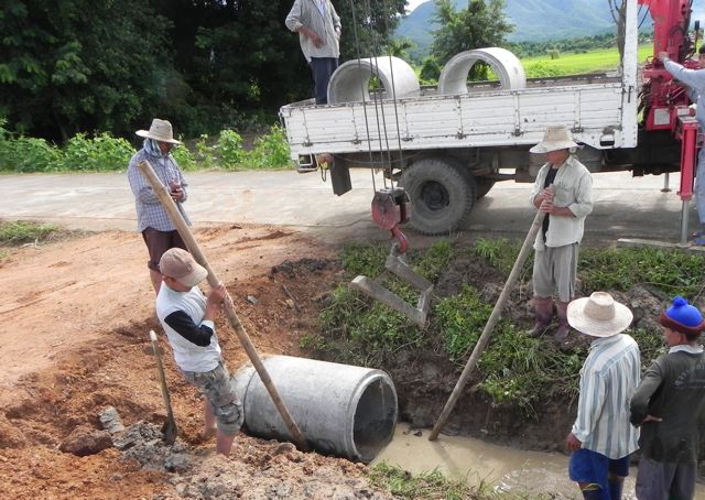 บรรดาช่างกำลังช่วยกันงัดท่อระบายน้ำ ที่ฝังไว้ตรงทางเข้าขนาดเก้าเมตร ท่อนี้ปกติจะเป็นท่อระบายน้ำทิ้งสำหรับในเมือง แต่ที่นี่สำหรับปล่อยในให้น้ำที่ชักมาจากคลองชลประทานเข้าที่นาของเพื่อนบ้าน