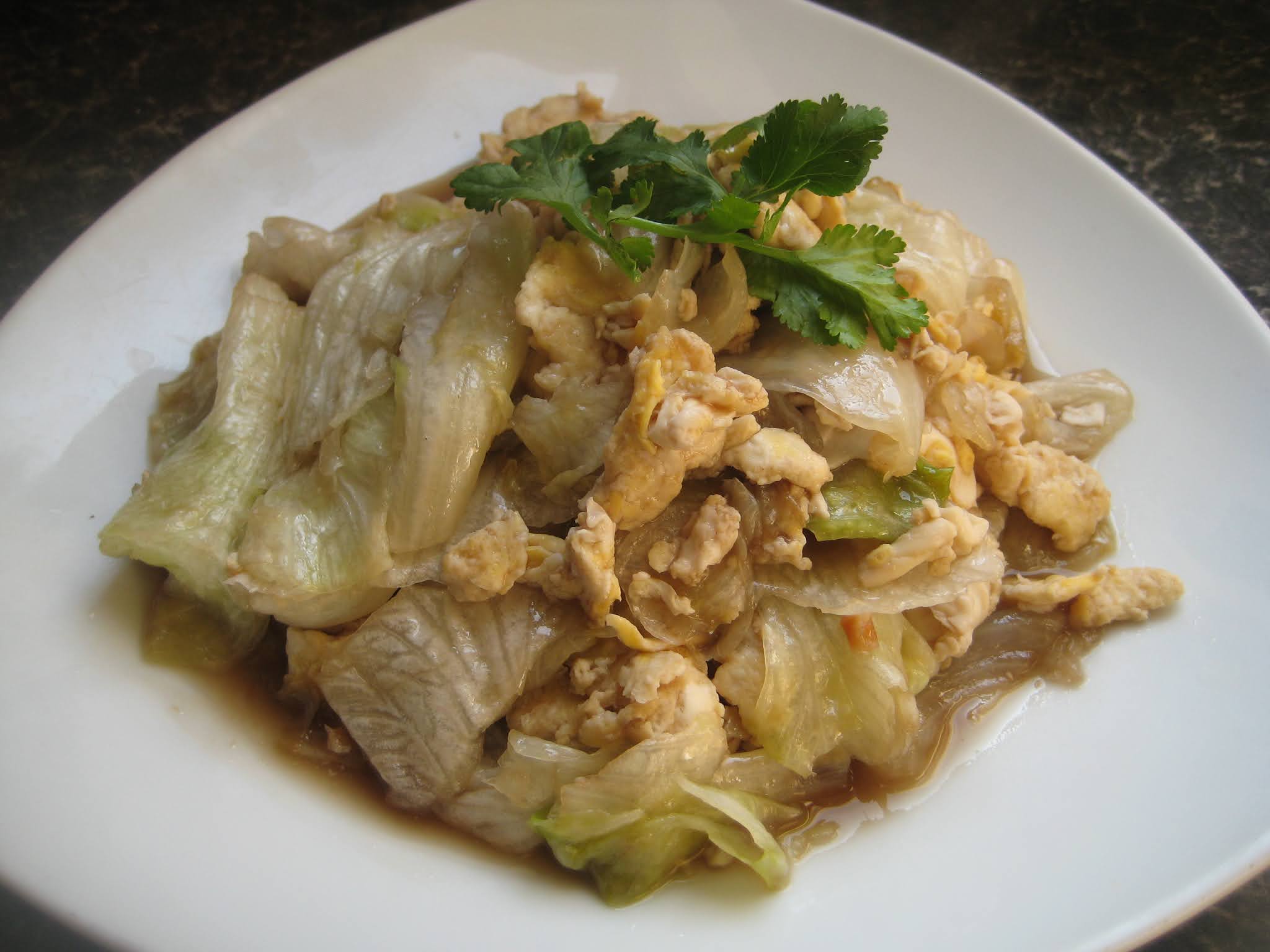 ส่วนผสม ไข่ไก่ ผักกาดแก้ว กระเทียม น้ำมันงา เกลือ พริกไทยป่น ซอสหอยนางรม วิธีทำ ตั้งกระทะใส่น้ำมันงาสำหรับทอดไข่ไก่ พอไข่เริ่มสุกยีให้แตกผัดให้เข้ากัน ปรุงรสด้วยเกลือ พริกไทยป่น ฉีกผักกาดแก้วใส่ลงไปผัดจนผักพอสุก ปรุงรสด้วยซอสหอยนางรมและน้ำตาลทรายเล็กน้อย