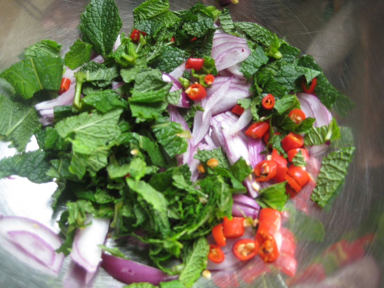 พริกสด หอมแดง สาระแหน่หั่นซอย น้ำปลา น้ำมะนาว น้ำตาลทราย พริกป่น ผงปรุงรส