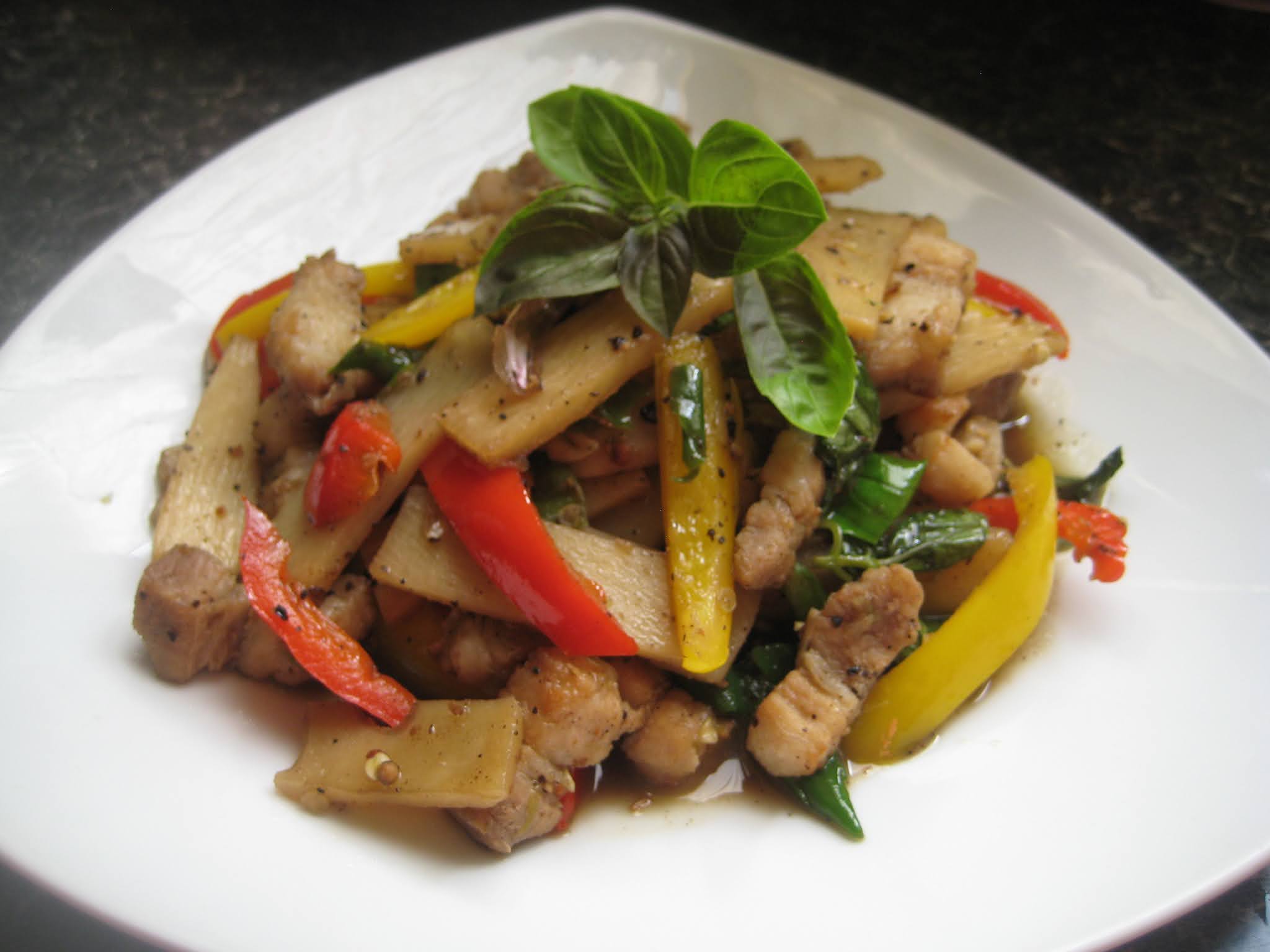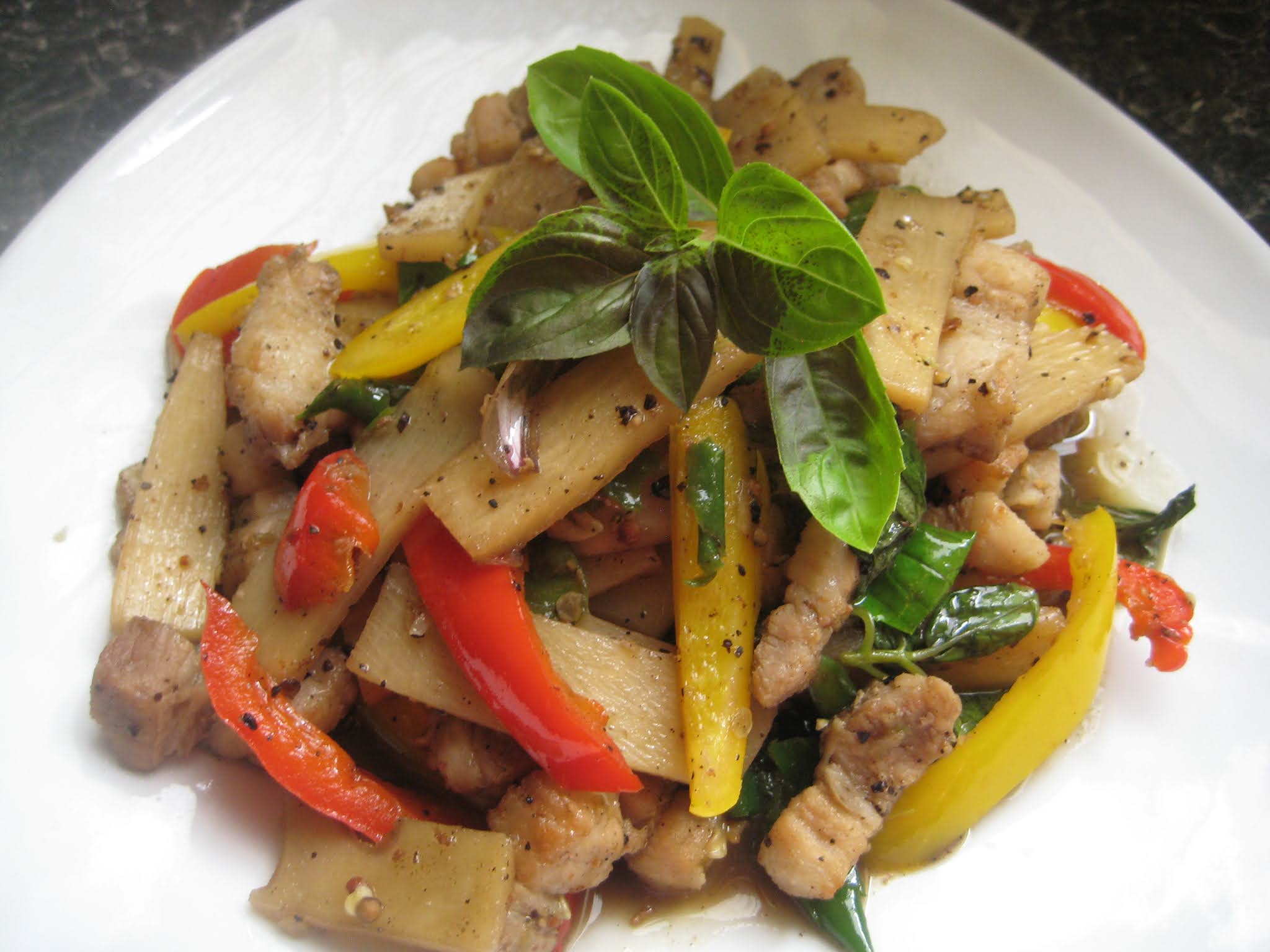 ส่วนผสม หน่อไม้ หมูสามชั้น พริกขี้หนู กระเทียม พริกไทย พริกชี้ฟ้า ใบโหระพา ซอสหอยนางรม น้ำตาลทราย น้ำปลา ซีอิ๊วขาว
