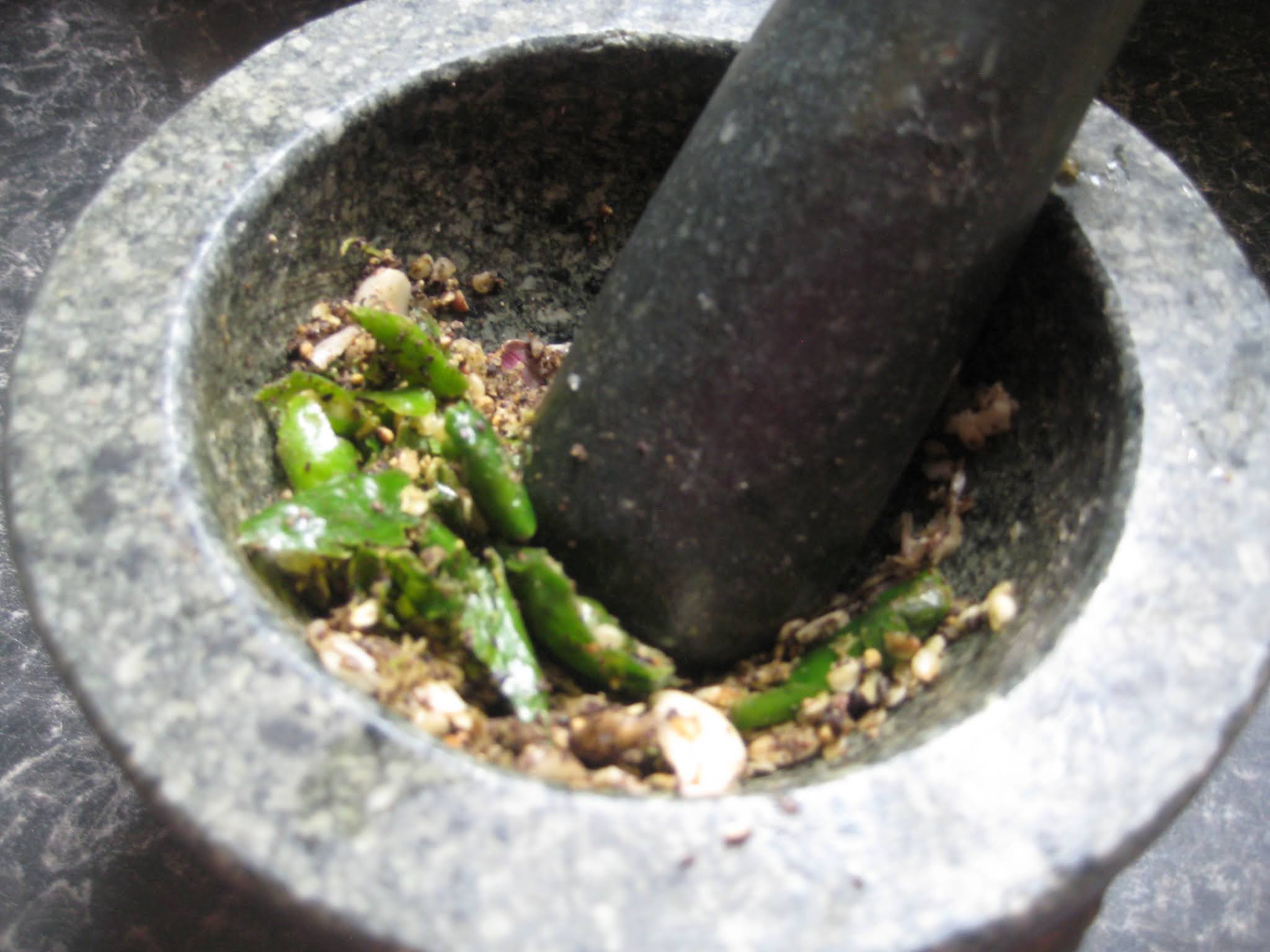 ใส่กระเทียมและพริกขี้หนูและพริกไทยที่โขลกเอาไว้ลงไปผัดให้หอม