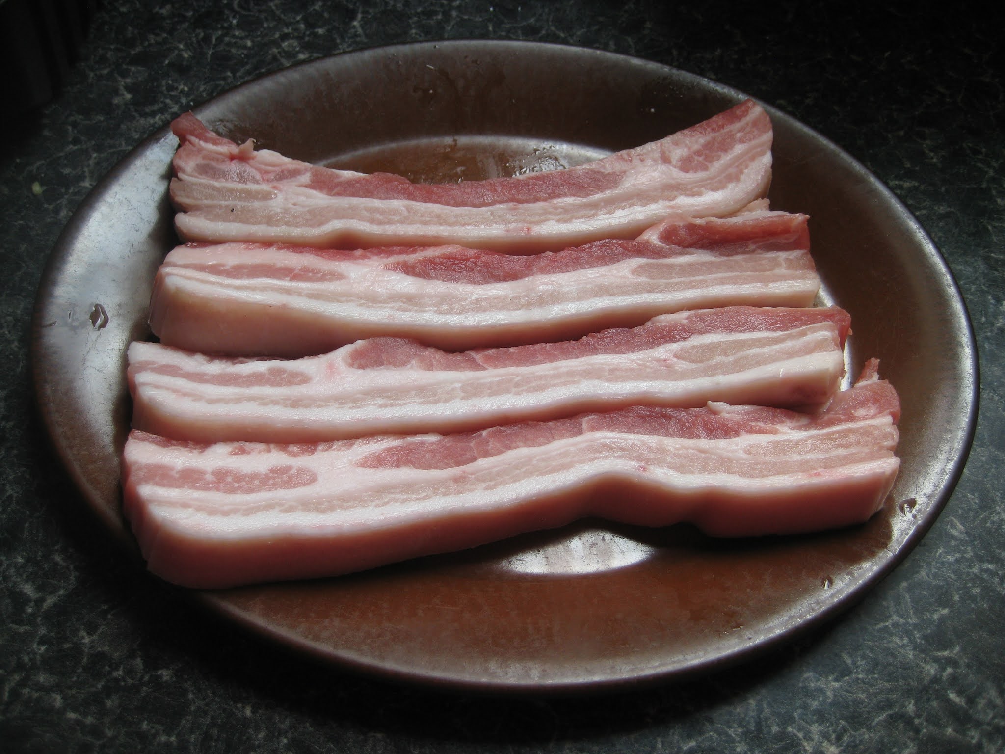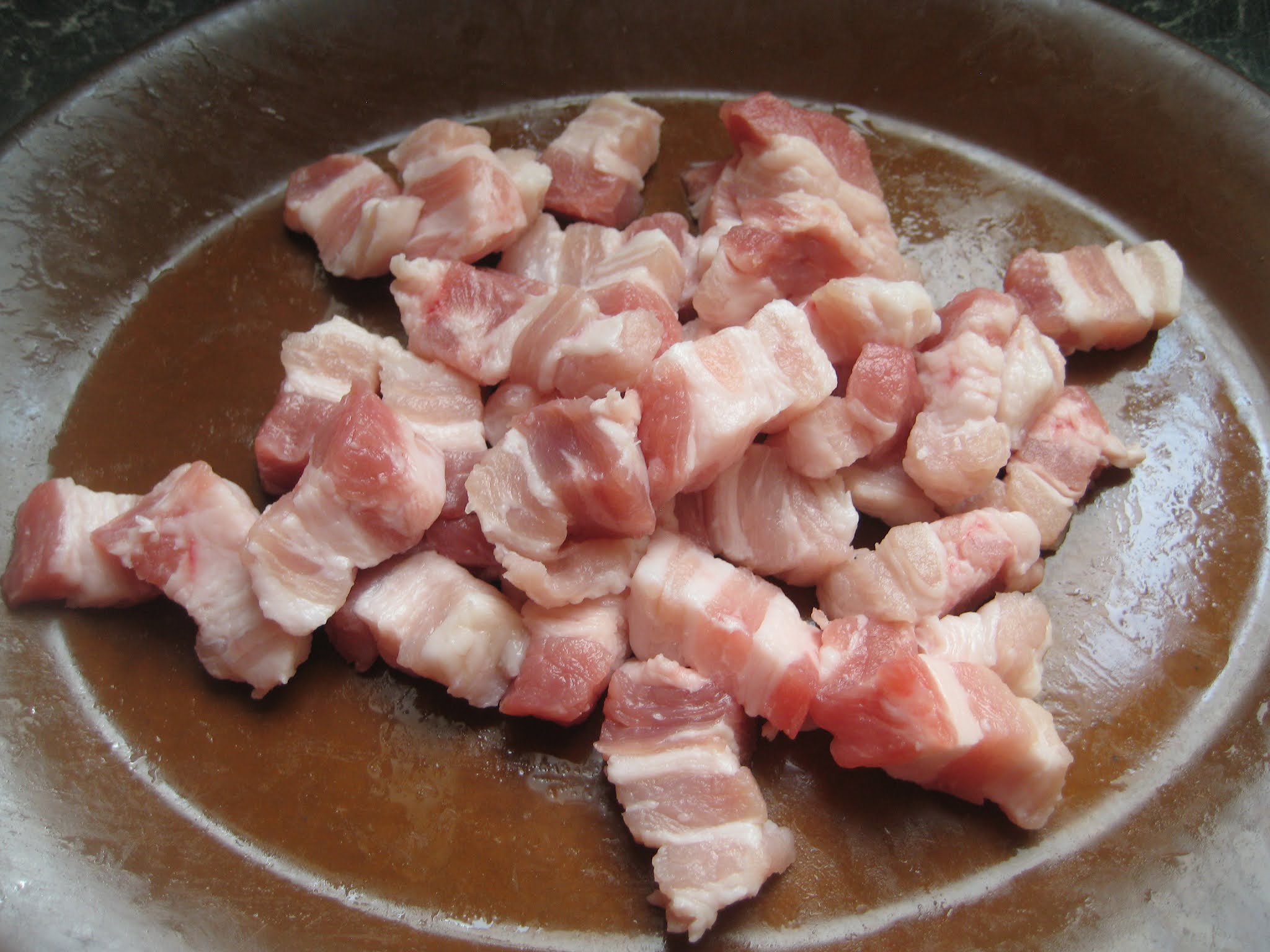 ตั้งกระทะบนเตาใส่หมูสามชั้นลงผัดจนกระทั้งออกน้ำมันออกจากหมู