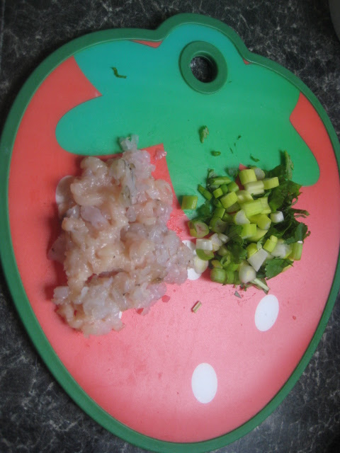 วิธีทำ สับกุ้ง ไก่ หั่นซอยต้นหอมผักชี
