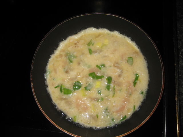 ตอกไข่ใส่ชาม ปรุงรสด้วยน้ำปลา พริกไทยป่น ตีผสมให้ไข่เป็นเนื้อเดียวกัน ใส่กุ้งสับ ไก่สับ ต้นหอมผักชีซอย ลงในถ้วย แล้วใส่ไข่ที่ตีไว้ลงไปตีให้เข้ากัน