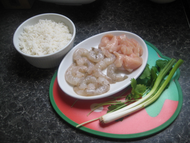 ส่วนผสม ข้าวสวยเย็น กุ้งสด เนื้ออกไก่ ไข่สด น้ำปลา พริกไทยป่น ต้นหอมผักชี น้ำมันพืชสำหรับทอด