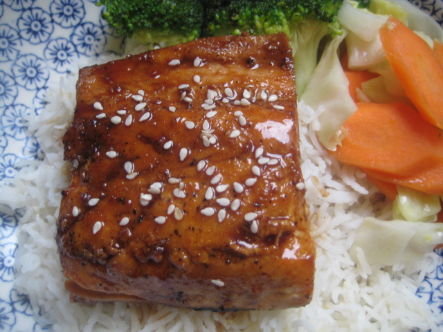 จัดชิ้นปลาวางบนข้าว ราดซอสเทอริยากิ โรยงาขาว พร้อมผัดผัดรวมเนยยกเสิร์ฟ