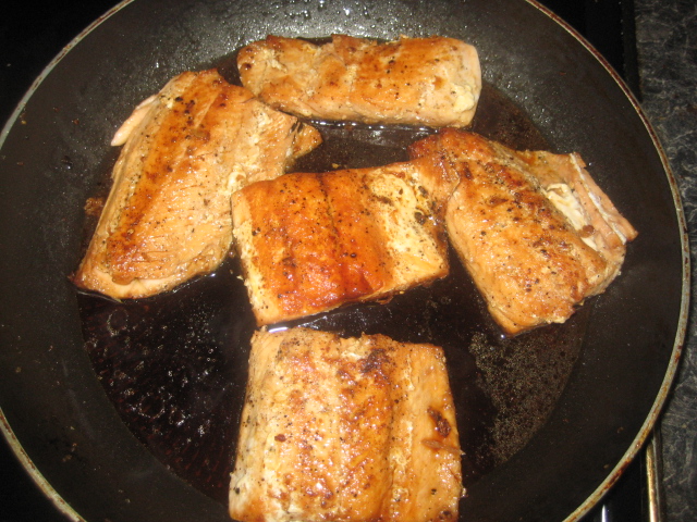 ตั้งกระทะเทฟลอนใส่น้ำมันลงในกระทะใช้ไฟกลาง พอน้ำมันร้อนใส่เนื้อปลาลงทอดจนผิวนอกสุกทั่ว ปิดไฟ ตักใส่ชาม เตรียมไว้