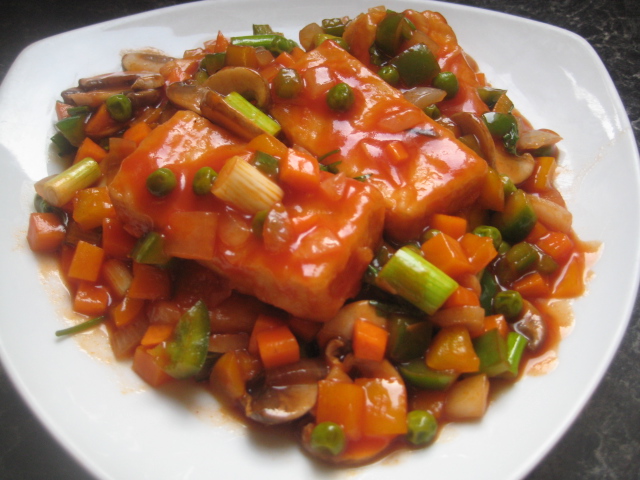 ส่วนผสม เต้าหู้ พริกหวาน หอมหัวใหญ่ ถั่วลันเตา แครรอท เห็ดหอมสด ต้นหอม ผักชี แป้งทอดกรอบ ซอสมะเขือเทศ ซอสพริก ซีอิ๊วขาว น้ำตาลทราย เกลือป่น น้ำเปล่า น้ำมันพืชสำหรับทอดและผัด