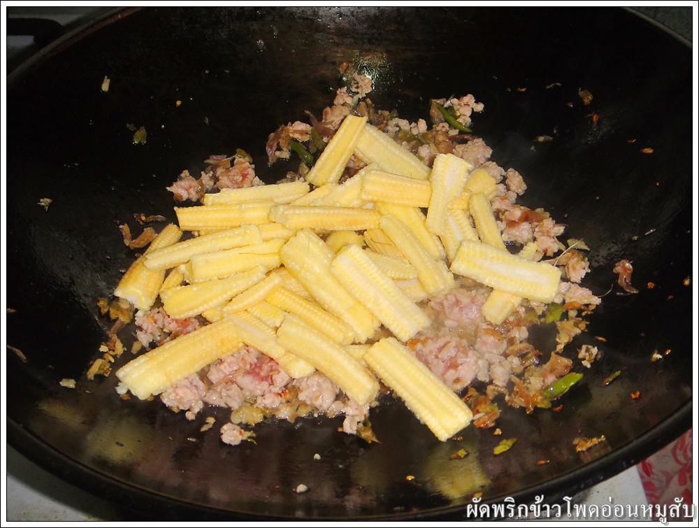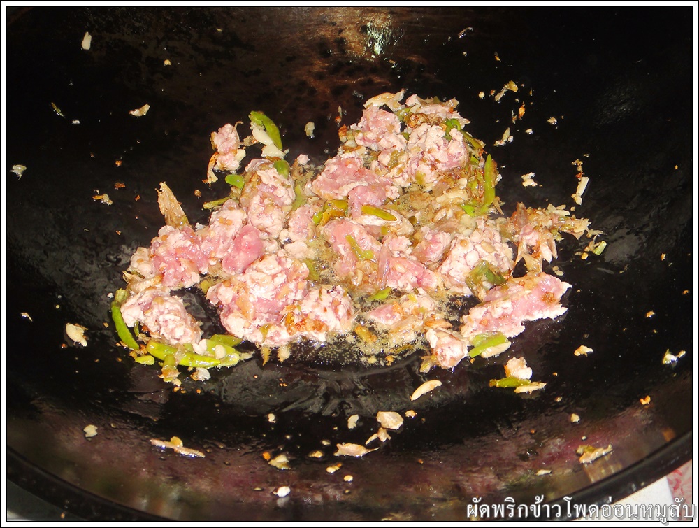 ใส่หมูสับแล้วผัดต่อจนหมูสุก