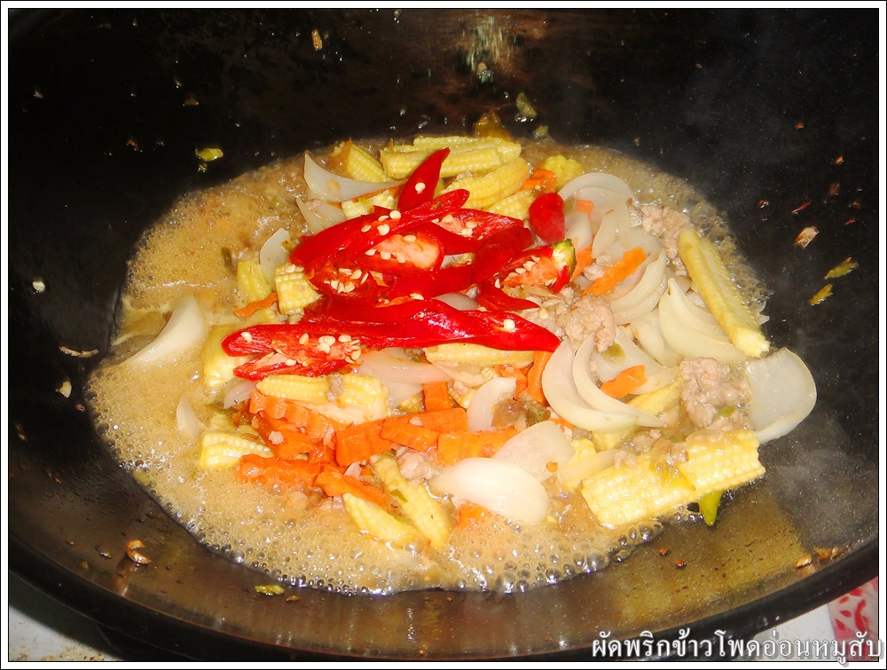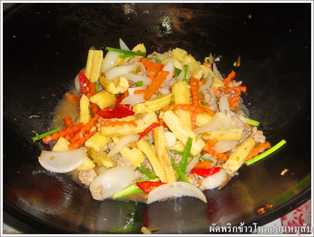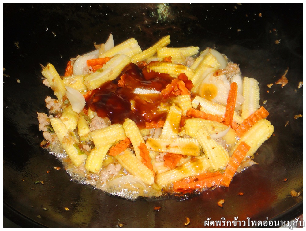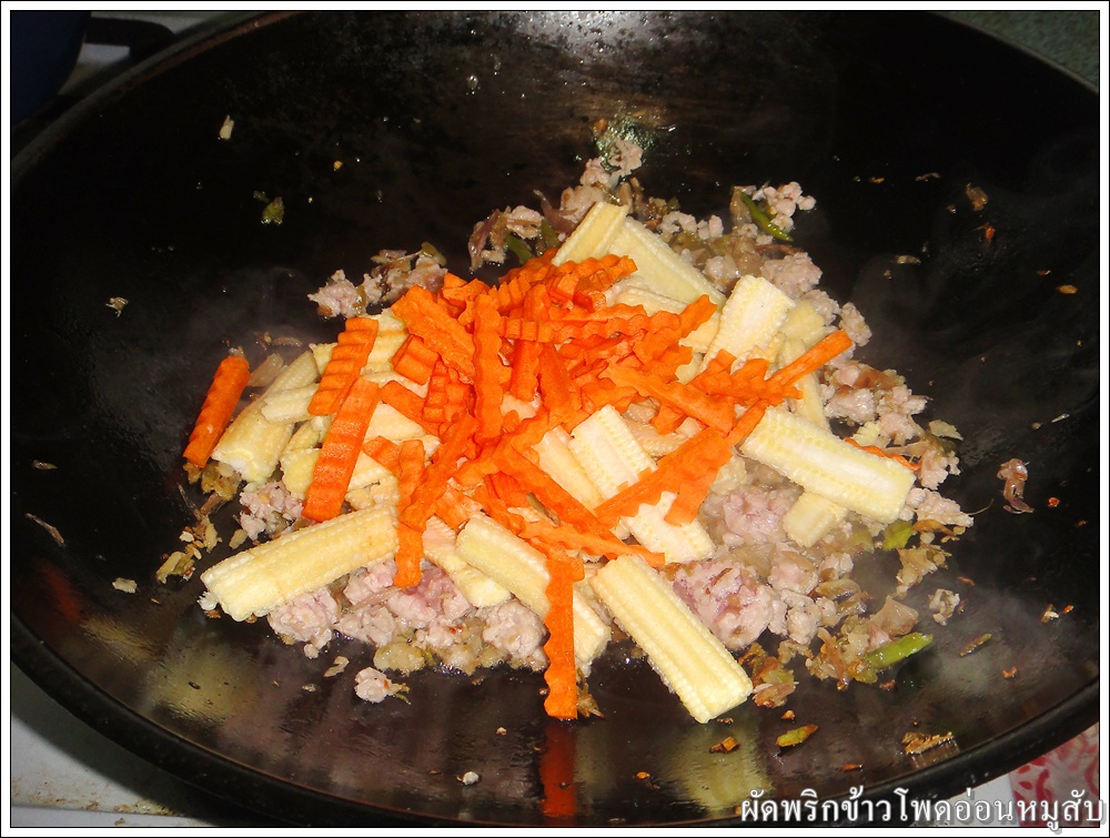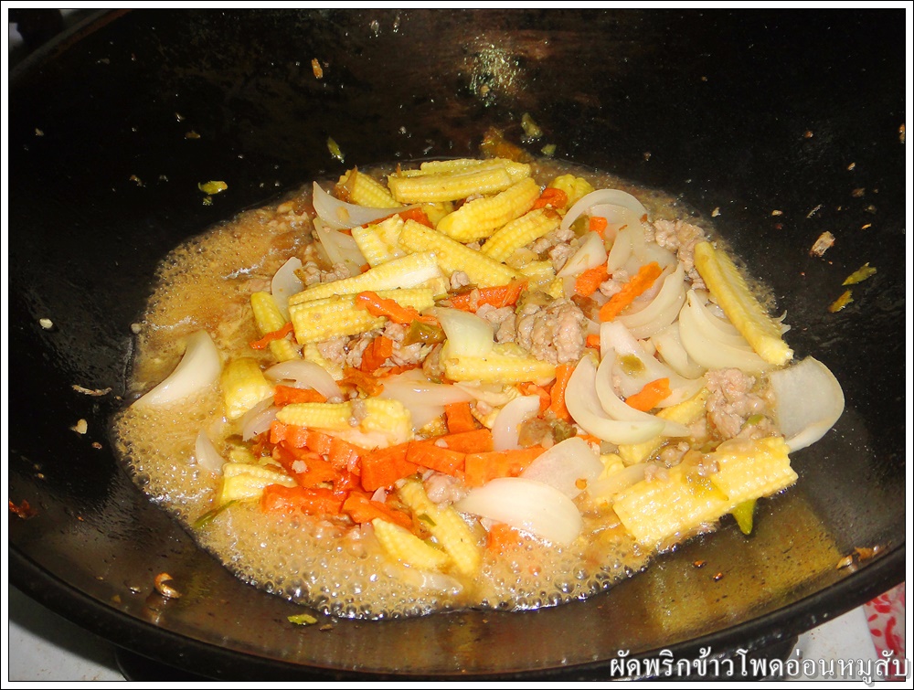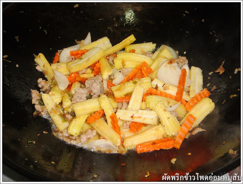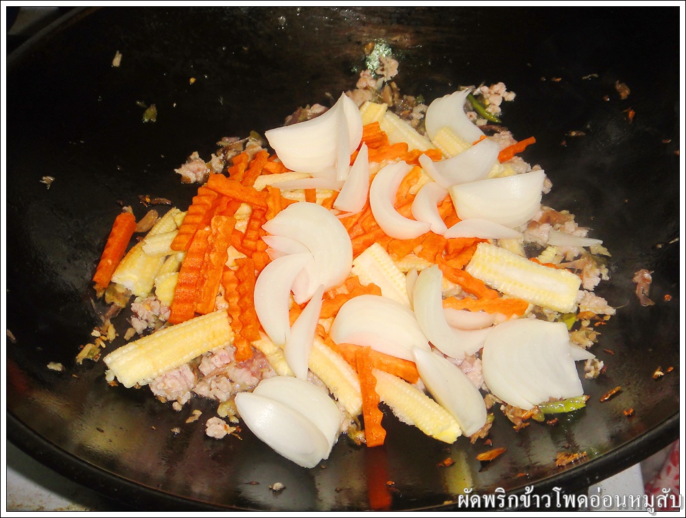 ใส่ข้าวโพดอ่อน แครอท และหอมใหญ่ ผัดให้เข้ากัน