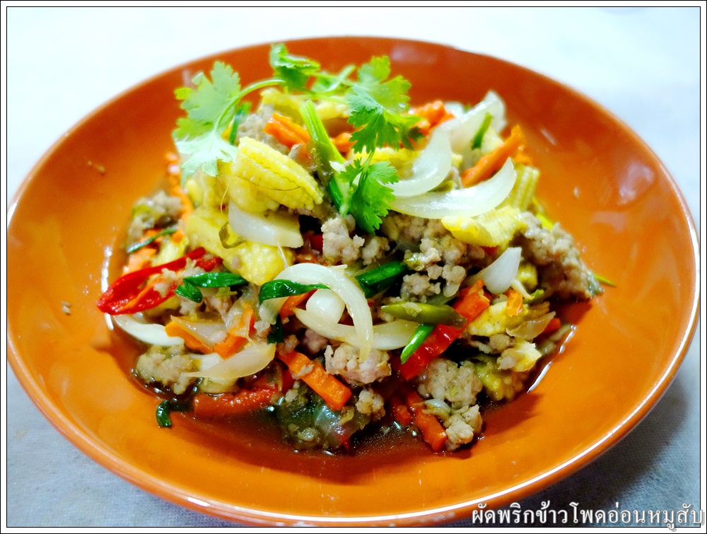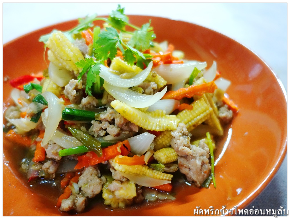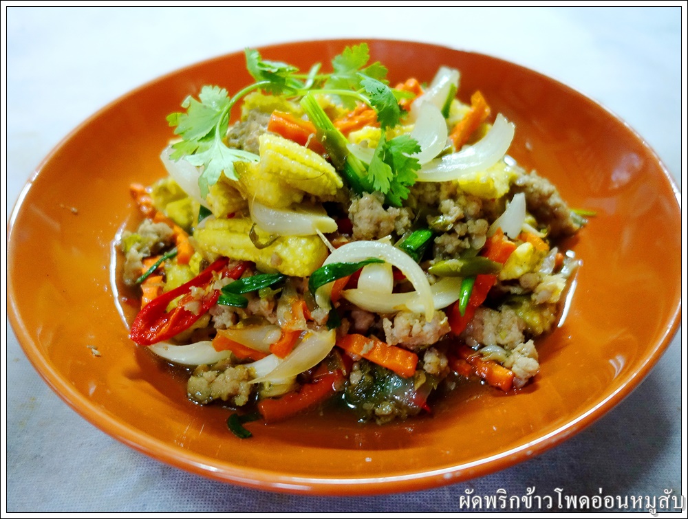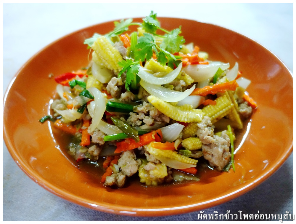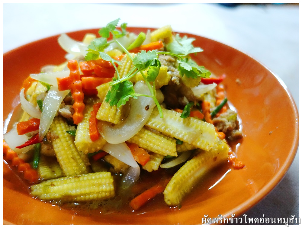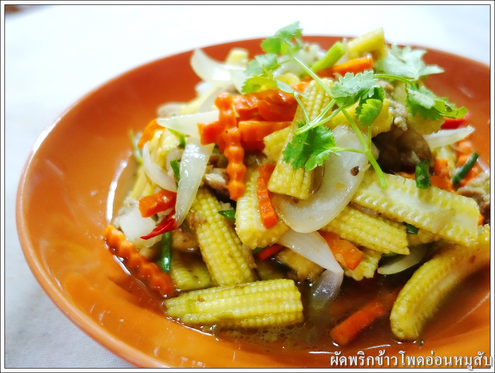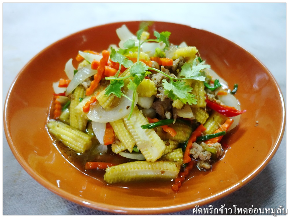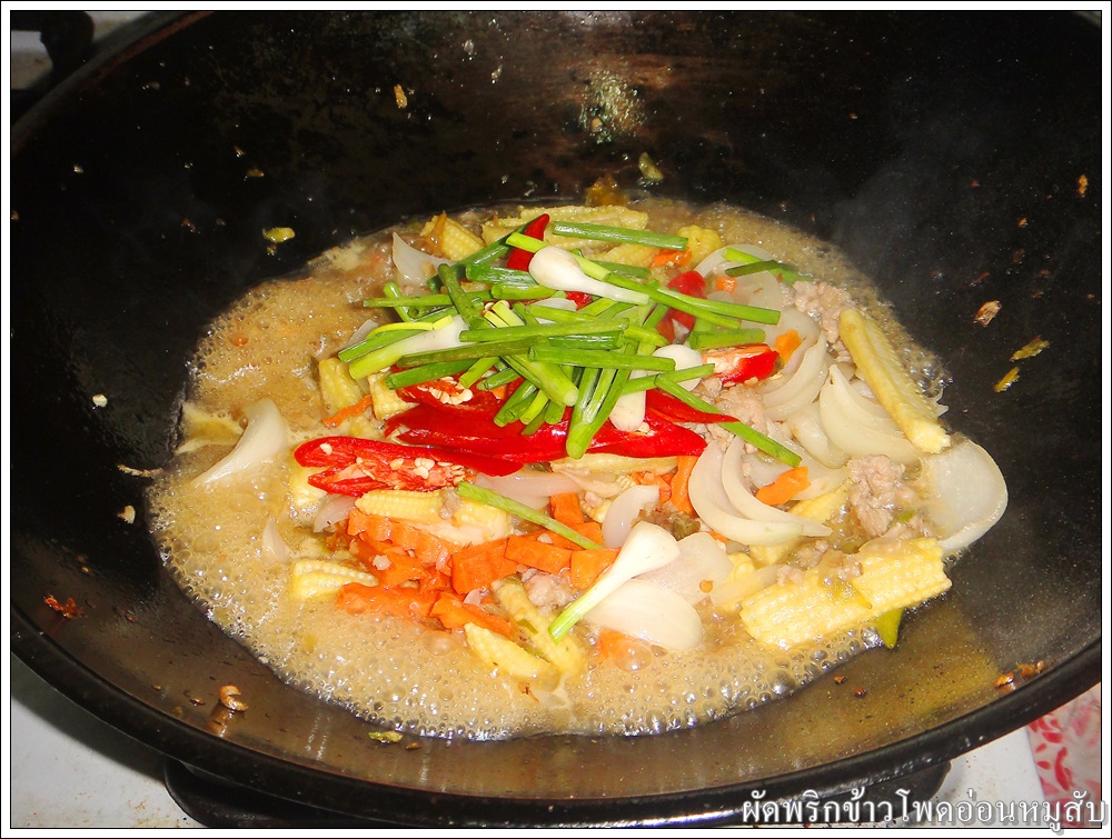 ใส่ข้าวโพดอ่อน แครอท และหอมใหญ่ ผัดให้เข้ากัน