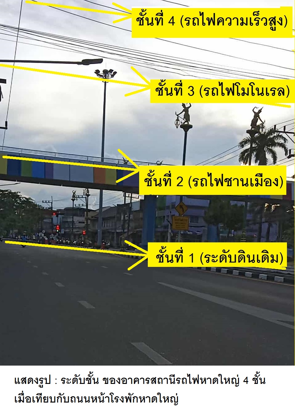 ก่อนอื่น เราควรจะต้องมาทำความเข้าใจระดับชั้นความสูงของอาคารรถไฟกลางหาดใหญ่ 4 ชั้น เมื่อเปรียบเทียบกับถนนเพชรเกษมกันก่อน