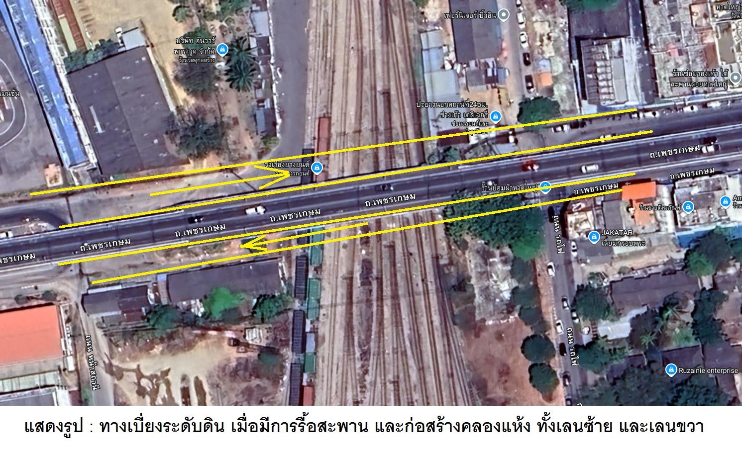แต่ทว่าในระหว่างการก่อสร้าง "คลองแห้ง" เรื่องการจราจรในเส้นทางนี้จะทำอย่างไร ...ซึ่งเมื่อพิจารณาจากรูปถ่าย จากดาวเทียมของสะพาน เราจะพบว่า มีพื้นที่ถนนด้านข้างของสะพาน ซึ่งเราสามารถทำทางเบี่ยงในระดับดินได้ โดยต้องมีเครื่องกั้นทาง หรือพนักงานคอยดูแลเวลารถไฟมา เรียกได้ว่า ชาวหาดใหญ่จะได้สัมผัสบรรยากาศ การใช้เส้นทางนี้ก่อนที่จะมีสะพาน หรือก่อนปี พ.ศ.2511 (ย้อยเวลาไปด้วยกัน) ...แต่ถึงอย่างนั้น การวางแผนการจราจรในระหว่างการก่อสร้างก็เป็นเรื่องสำคัญ ดังนั้นก่อนจะมีการรื้อสะพาน และการสร้างคลองแห้งนั่น บริษัทผู้รับเหมา ต้องออกแบบการก่อสร้างโดย ต้องใช้เวลาในการสร้างให้สั้นที่สุด และการรถไฟฯ หากสามารถหลีกเลี่ยง ขบวนรถในช่วงเวลาเร่งด่วนได้คงจะดีไม่น้อย