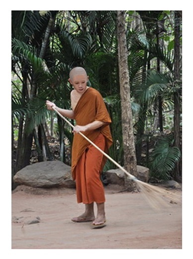 อย่านึกว่าไม่เหนื่อยไม่เมื่อย..จะเลือกกวาดแต่ในร่มก็ไม่ได้ ตากแดดสักพักเหงื่อโทรมกายฝ่ามือแดงเถือก พระชัยหงายมือออกดู ขยำคลายเมื่อย..ผมอยากโชว์พลัง รู้ดีว่ามีสายตาหลายคู่แอบมองอยู่..ได้เรื่อง ฝ่ามือพองเมื่อหนึ่งชั่วโมงผ่านไป และเหมือนจะเคร่งมากเพราะไม่ใส่รองเท้า กรวดหินเล็ก ๆ ย้ำเท้าที่เจ็บระบมจากการเดินบิณฑบาตเมื่อเช้าให้ระบมมากขึ้น