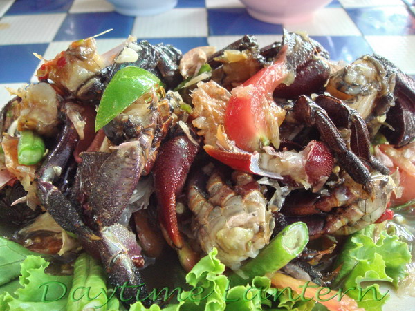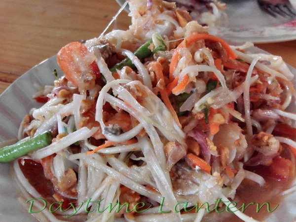 จานแรก ส้มตำปูม้า คัดมาแต่ปูม้าวัยเจริญพันธ์ อวบอัดน่ารับประทาน ตัวประกอบอื่นๆ ล้วนแต่ของดีมีคุณภาพ ชอบใจพริกขี้หนูสวนเม็ดจิ๋วๆกับกุ้งแห้งตัวใหญ่แต่แบนบาง ซึมซับรสชาติของเครื่องปรุงรสไว้เต็มที่