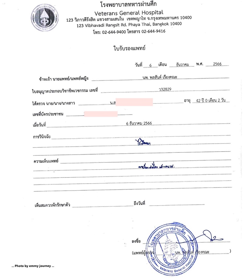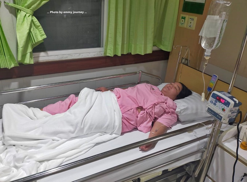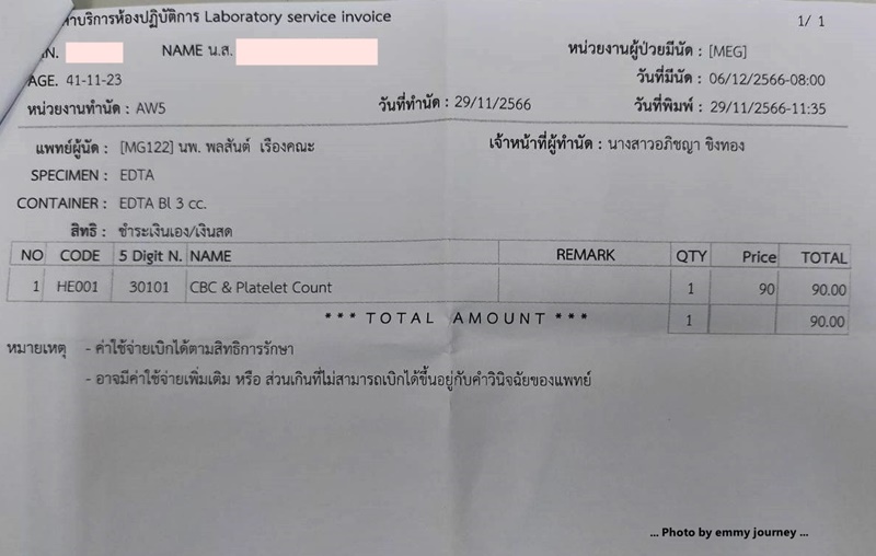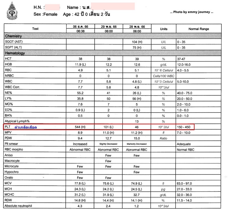 ตอนเข้าไปพบหมอ เราก็เล่าอาการและรายละเอียดต่างๆ ให้ฟังว่ามีอาการอ่อนเพลีย อยากนอนทั้งวัน ไม่อยากอาหาร ถ่ายเหลวเป็นสีน้ำตาลเข้ม เขียวๆ เหลืองๆ อาเจียนนิดๆ เป็นสีน้ำตาลบางครั้งก็มีเสมหะใสๆ ออกมา ก่อนมาหาหมอสัก 2-3 วัน มีเลือดออกในโพรงจมูก แต่ไม่มาก (ซึ่งเราก็นึกว่าอาการเย็น อากาศแห้ง ทำให้โพรงจมูกเราแห้งเป็นแผลเวลาแคะขี้มูกเหมือนเช่นที่เคยเป็น) เราบอกหมอเป็นมาตั้งแต่วันที่ 21 พฤศจิกายน 2566 แล้ว กว่าจะมาหาหมอที่โรงพยาบาลก็ 7 วัน เข้าไปแล้ว หมอยังบอกว่าโอ๊ย...ถ้าคุณเป็นไข้เลือดออก มาหาหมอป่านนี้ก็คงหายไปแล้วแหละ เพราะนี้ก็ผ่านมา 5-6 วันแล้ว และหมอก็ส่งเราไปเจาะเลือด เพื่อตรวจดูผลเลือดว่าเป็นอะไรกันแน่