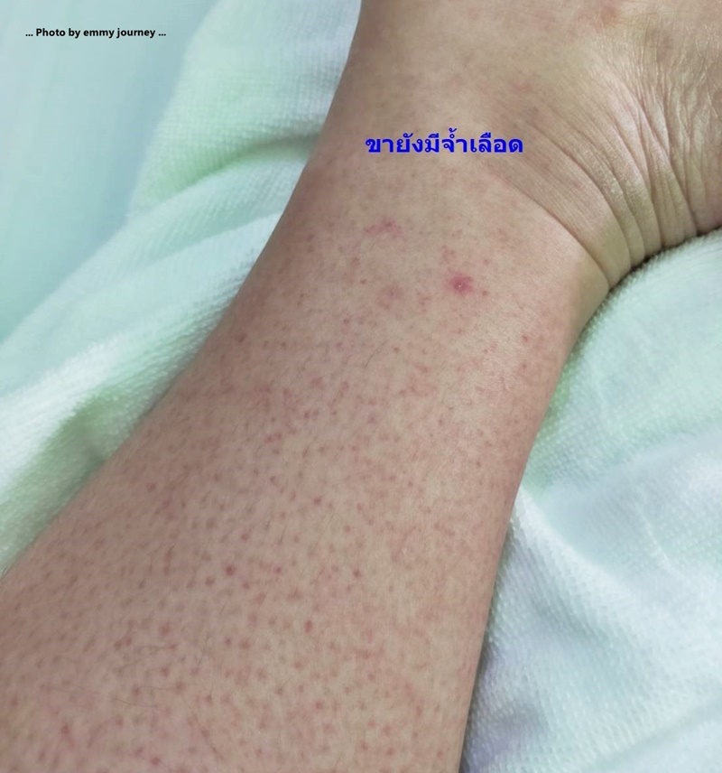 เราโดนเจาะเลือด 4 จุด เพราะวันนั้นตัวบวม หาเส้นเลือดได้ยาก ตอนโดนเจาะเจ็บระบมไปหมด เจาะที่ข้อพับไม่ได้ ก็มาเจาะที่โคนนิ้วหัวแม่มือซ้ายตรงที่เห็นเส้นเลือด เจาะที่หลังมือบริเวณนิ้วก้อยด้ายซ้าย ปวดมาก สรุป...ผลเลือดออกมาเราเป็นไข้เลือดออกจ้า เกล็ดเลือดเหลือแค่ 10,000 จากที่คนปกติต้องมีเกล็ดเลือด 150,000-450,000 และจุดจ้ำเลือดนั่นคือภาวะเกล็ดเลือดต่ำ เรายังไม่รู้เลยว่าไปโดนยุงกัดตอนไหน แต่ช่วงที่บ้านมีต้นไม้ยุงก็เยอะอยู่บินเข้าบ้านบ่อย