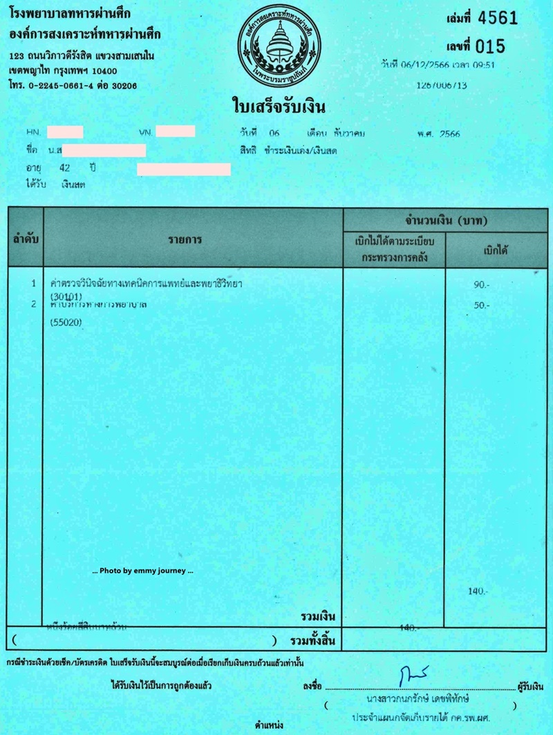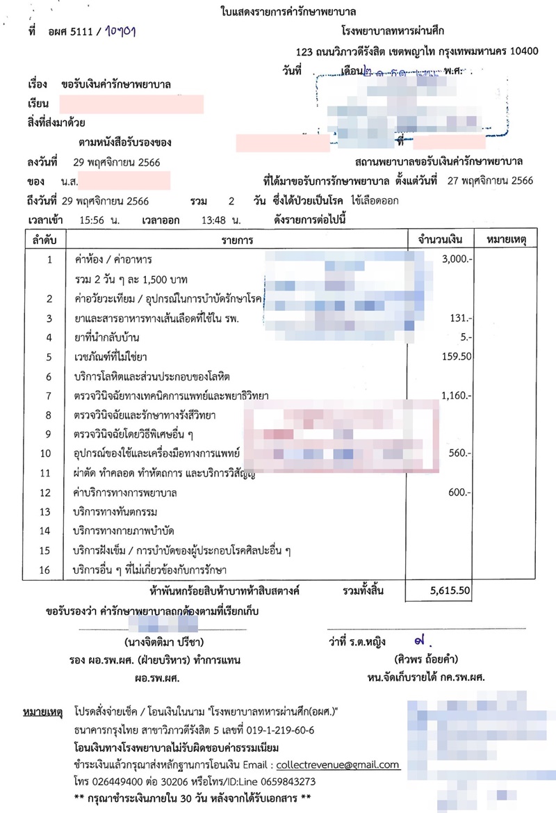 เมื่อวันที่ 21 ธันวาคม 2566 โรงพยาบาลส่งเอกสารเรียกเก็บเงินมาทางที่ทำงาน เนื่องจากเราทำหนังสือส่งตัวเข้ารับการรักษาที่โรงพยาบาล และต้องจ่ายเงินส่วนเกินเอง โรงพยาบาลเรียกเก็บ 5,615.50 บาท บาท (เราจ่ายค่าส่วนเกินไป 612.50 บาท) รวมเงินค่ารักษาทั้งสิ้น 6,228 บาท