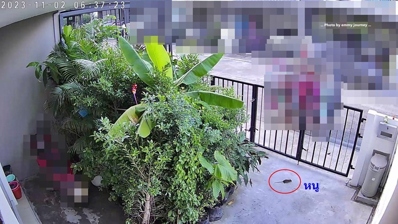 ภาพตอนคุณสามีเลี้ยงต้นไม้ มีอ่างปลา อ่างบัว อยู่หน้ารั้ว สามีเห็นว่าช่วงหน้าหนาวหน้าบ้านโดนแดดเต็มกลัวบ้านร้อนเลยซื้อต้นไม้มาวางกันแดด ทั้งๆ ที่เราก็ติดฟิลม์กันแดดที่กระจกทั้งหลัง (ตั้งแต่ซื้อบ้านแรกๆ เราตั้งใจไว้แล้วว่าจะไม่ทำหลังคาหน้าบ้าน เราชอบแดดจะเอาแดดไว้ตากผ้า และเผื่ออนาคตหากไม่ผิดกฎหมายจะต่อเติมเป็นห้องแทน) เคยมีวันหนึ่งเราจับภาพหนูวิ่งออกมาได้ มันซุกอยู่ในมุมต้นไม้เป็นแหล่งหลับนอน ได้ยินเสียงมันร้องจี๊ดๆ ทะเลาะกันด้วยต้องมีหนูมากว่า 1 ตัวแน่นอน