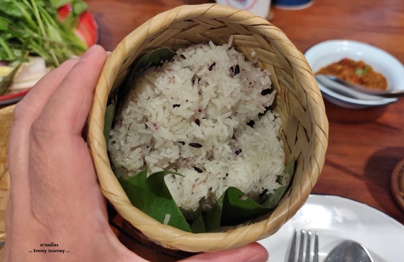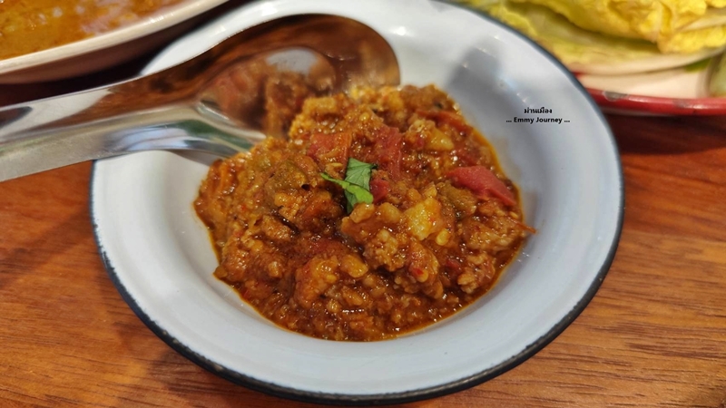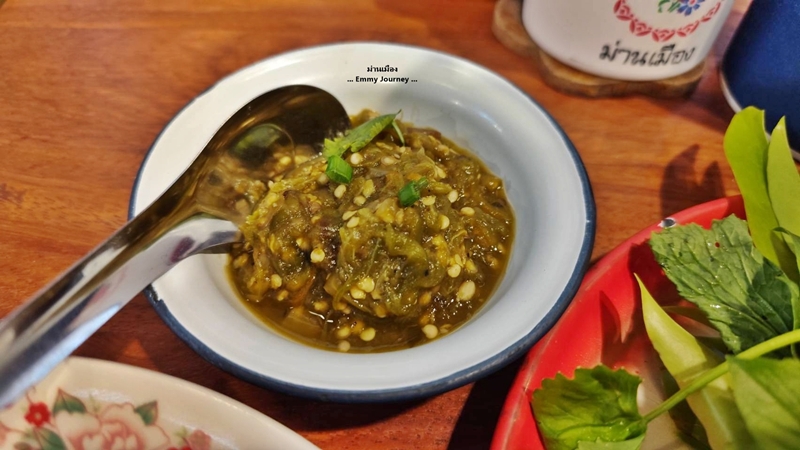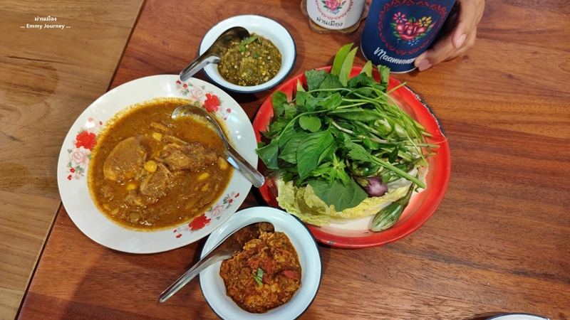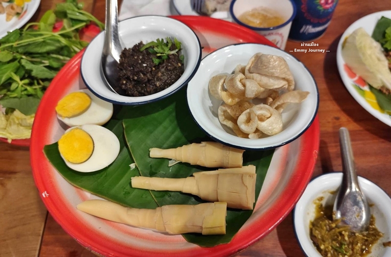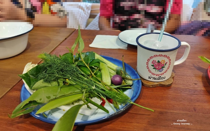 ภาชนะใส่อาหารใช้สังกะสีเคลือบลายโบราณ ชอบๆ คิดถึงตอนเด็กเลย ทางร้านมีผักสดหลายชนิดบริการ ทานคู่กับน้ำพริก