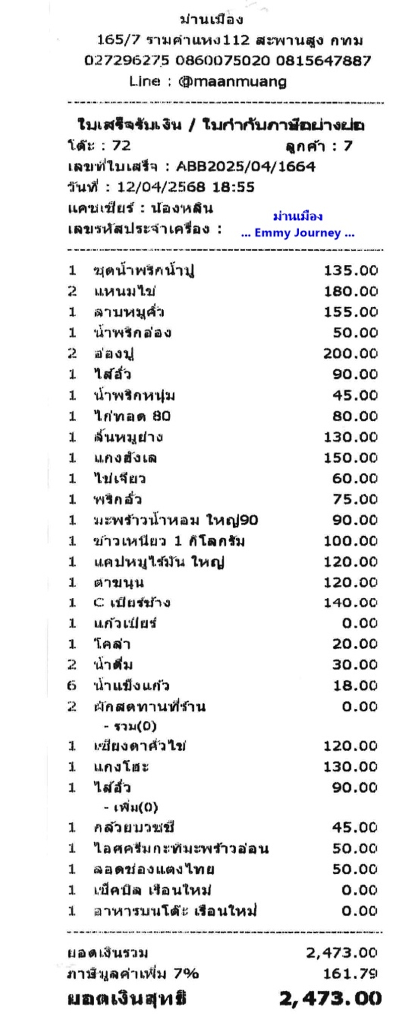 มื้อนี้จ่ายไป 2,473 บาท (ราคาอาหาร ณ เดือนเมษายน 2568) อาหารจานไม่ใหญ่ มาแบบหิวๆ คงไม่อิ่ม แลดูต้องสั่งหลายจาน ราคาอาหารค่อนข้างสูงเมื่อเทียบกับปริมาณอาหารที่ได้รับ สำหรับเราอาหารรสชาติดีอยู่ค่ะ
