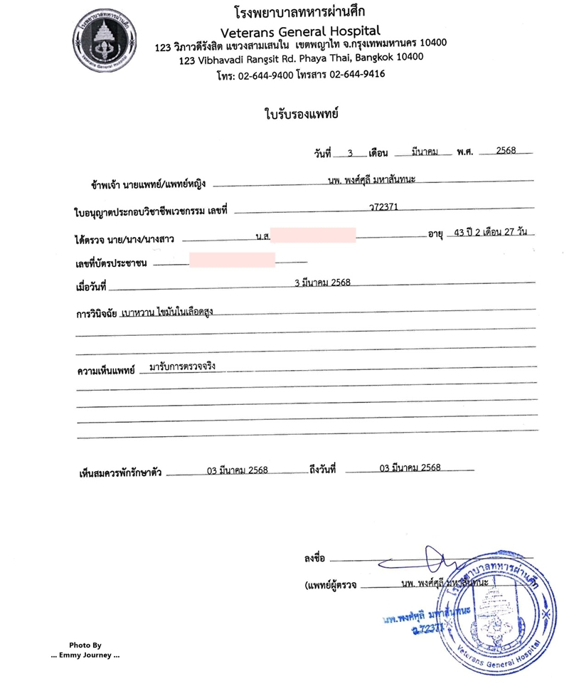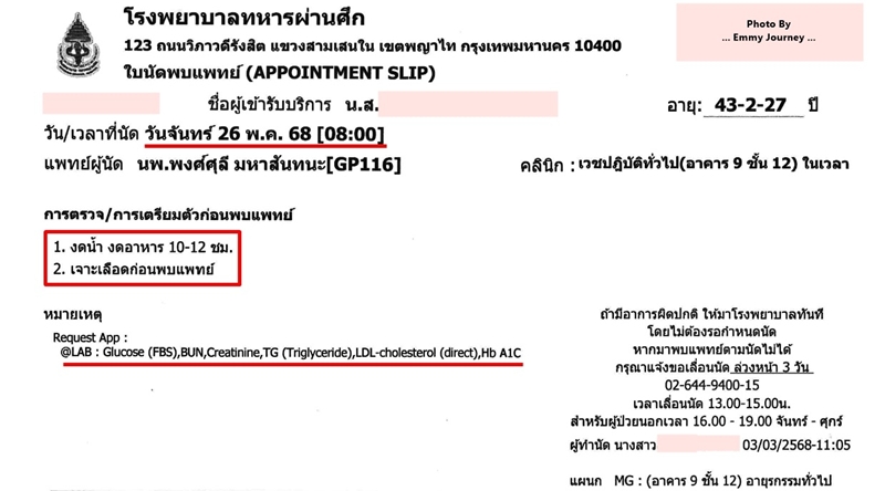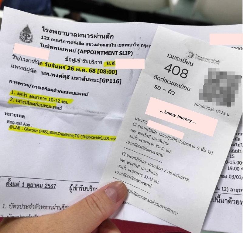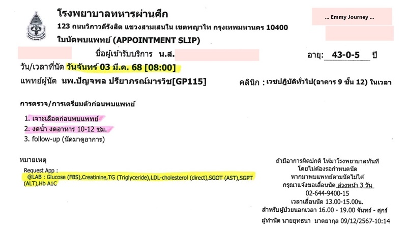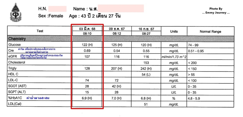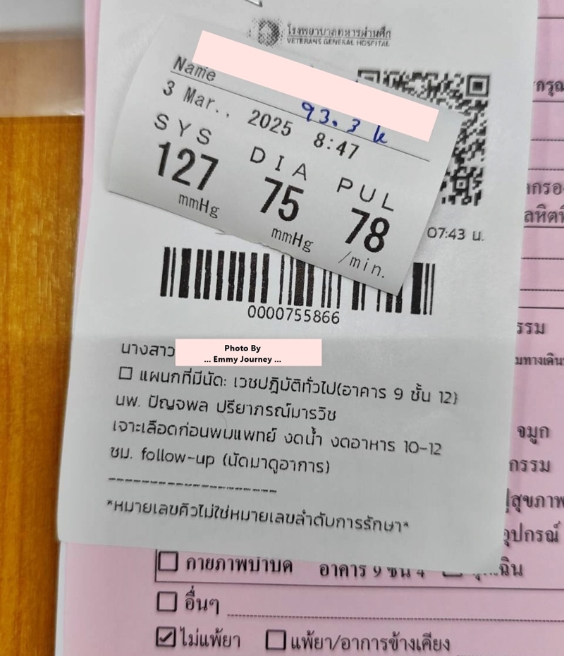 วันจันทร์ที่ 3 มีนาคม 2568 ครบรอบหมอนัดเจาะเลือดเพื่อตรวจน้ำตาลในเลือด / ค่าน้ำตาลสะสม และไขมันในเลือด รอบนี้ค่าความดันอยู่ในเกณฑ์โอเค ตอนเจาะเลือดเรายังคงหาเส้นเลือดยากเหมือนเดิม (เขียนรีวิวไว้ในหัวข้อรักษาโรคไขมันในเลือดสูง+ไขมันพอกตับด้วยแล้ว) ไม่เคยได้เจาะเลือดครั้งเดียวผ่านแบบคนอื่นเขาหรอก คนแบบเรามันต้องโดนเจาะ 2 แขน ฮ่าๆๆ
