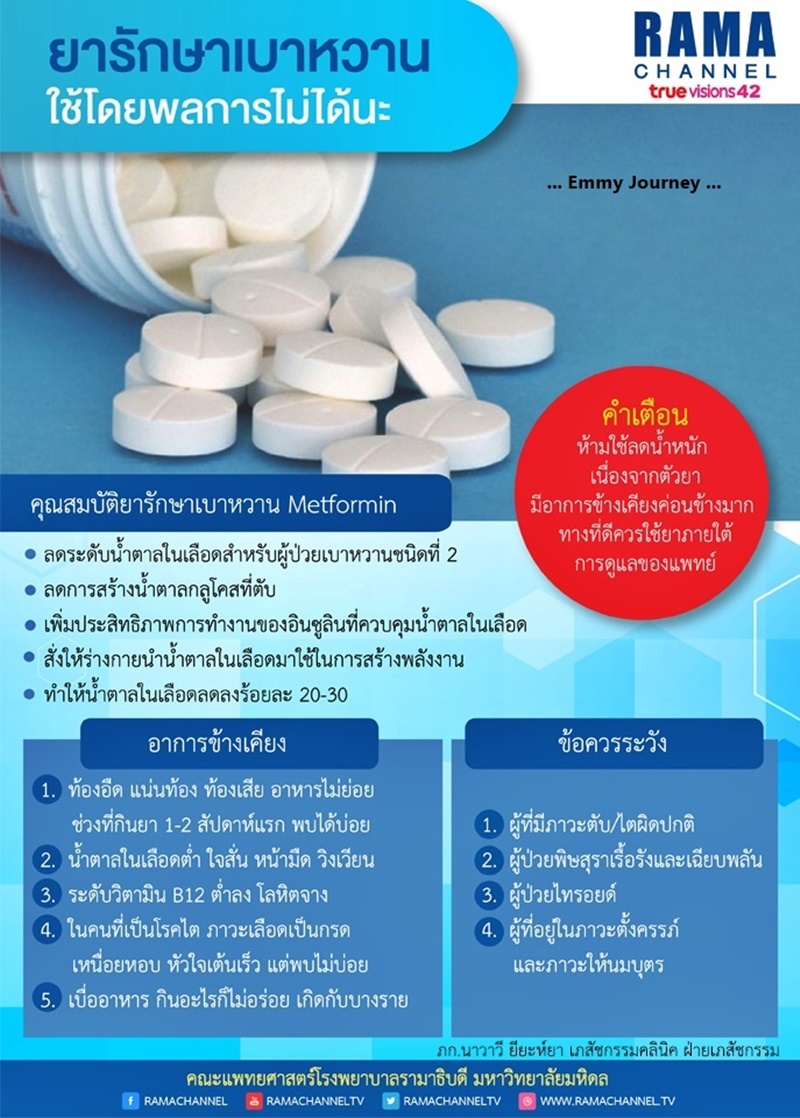 หมอให้ยามาทาน 3 เดือน Metformin (เมทฟอร์มิน) เป็นยารักษาโรคเบาหวาน ส่วนใหญ่แล้วจะใช้กับผู้ป่วยโรคเบาหวานชนิดที่ 2 ซึ่งมีภาวะดื้ออินซูลิน โดยจะใช้รักษาร่วมกับอินซูลินหรือยาชนิดอื่นด้วย ตัวยาจะช่วยในการควบคุมระดับน้ำตาลในเลือดหรือกลูโคส โดยลดกระบวนการสร้างกลูโคสจากตับ ลดการดูดซึมกลูโคสภายในลำไส้ และกระตุ้นความไวต่ออินซูลินในร่างกาย ทำให้มีการนำกลูโคสกลับเข้าไปในเซลล์และนำกลูโคสไปใช้เพิ่มขึ้น