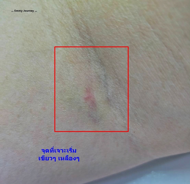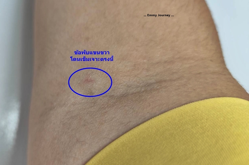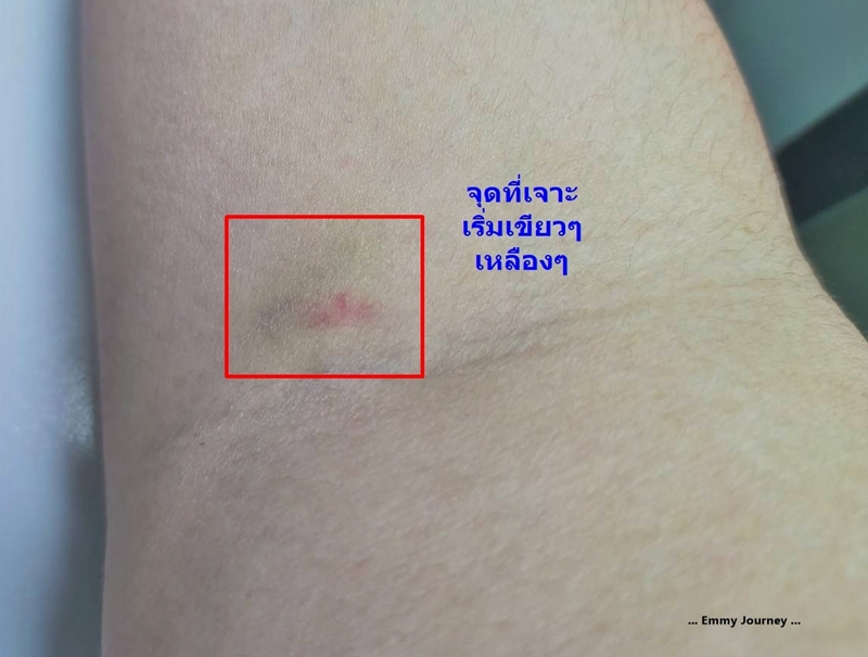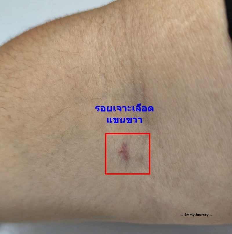 วันถัดมาแขนขวาจุดที่โดนเจาะเลือดเริ่มช้ำ
