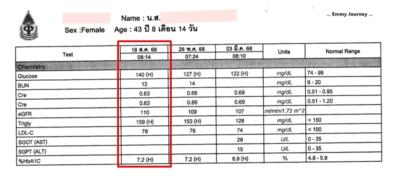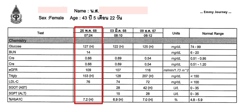 เกริ่นนำก่อนค่ะ....ช่วงเดือนเมษายน 2566 ที่ไปตรวจสุขภาพครั้งใหญ่ ผลน้ำตาลในเลือด 115 หมอที่คลินิกศูนย์แพทย์พัฒนาก็บอกว่าน้ำตาลเริ่มสูงแล้วนะ เราก็ไม่ได้คุมอาหารอย่างจริงจัง เวลาไปเจาะเลือดเพื่อตรวจไขมันในเลือด หมอก็พ่วงตรวจน้ำตาลในเลือดให้ด้วย ตอนเดือนกันยายน 2567 น้ำตาลก็ยังสูงอยู่ที่ 120 หมอบอกว่าเอายาไปกินไหม เราก็บอกว่าจะงด ลดน้ำตาล แต่ก็นะ...ยังไม่คุม จนมาเดือนกันยายน 2567 น้ำตาลก็ทะยานพุ่งขึ้นถึง 125 ส่วนน้ำตาลสะสม 7.0(พระเจ้า!!) หมอบอกว่าเอายาไปทานเถอะ ผลเลือดคนไข้ไม่ดีเลย เดี๋ยวจะรักษายากกว่านี้ หมอบอกมันเป็นระยะแรกเริ่มของโรคเบาหวาน = เบาหวานแฝง