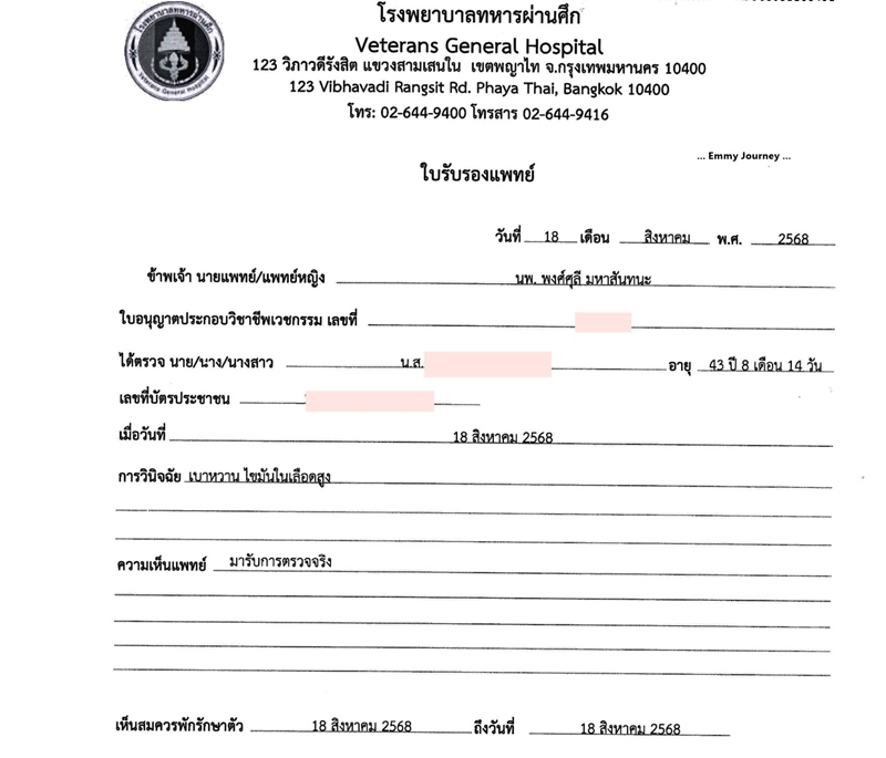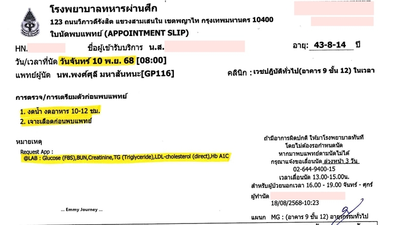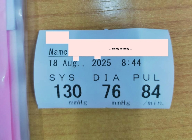 วันจันทร์ที่ 18 สิงหาคม 2568 ครบรอบหมอนัดเจาะเลือดเพื่อตรวจน้ำตาลในเลือด / ค่าน้ำตาลสะสม และไขมันในเลือด รอบนี้ค่าความดันอยู่ในเกณฑ์โอเค วัดได้ 130/76 ชีพจร 84 (เราว่ายังสูงนะ)