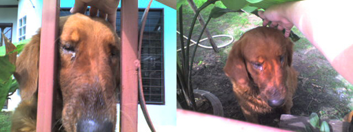 ช่วงนี้ ก็เป็นห่วงน้องหมาอีกตัวนึง เป็นน้องหมาของเพื่อนบ้านฝั่งตรงข้าม พันธุ์โกลเด้นรีทรีฟเวอร์ ตัวใหญ่ม๊าาาาก แขน เอ๊ย ขาหน้ามัน ไซส์เท่าแขนเราเลย ได้ยินมานานว่าหมาพันธุ์โกลเด้นฯเป็นหมาใจดี พอได้ลองเล่นกับมันจริงๆ(อาศัยยื่นมือเข้าไปเล่นในรั้วบ้านเค้า แบบว่าเก็บกดอ่ะ ที่บ้านไม่ให้เลี้ยง เล่นกับหมาของชาวบ้านก็ได้) โอ้โห เชื่องมากๆๆๆ ทุกวันนี้เล่นจนมันจำได้ เดินไปหน้าบ้านทีไร มันก็จะวิ่งมากระโดดเกาะรั้ว แล้วก็กระดิกหาง มันน่าร้าาาก ขนาดนี้ แต่ก็น่าเป็นห่วงเรื่องสุขภาพของมัน ที่ตามันไม่รู้เป็นอะไร ขี้ตาเยิ้มมากๆ แล้วก็แห้งเกาะตาบนกับตาล่าง เวลามันลืมตา ก็จะถูกขี้ตาบัง เคยพยายามเอาทิชชู่ไปเช็ดให้ แต่เช็ดไม่ออก เพราะมันเกาะจนเหนียวหนึบ ต้องดึงออกแรงๆ แต่น้องหมาก็กลัว เวลาเอามือไปใกล้ๆ ตา มันก็จะเบนหน้าหนี หลับตาปี๋ วุ้ย น่าสงสารรรร แถมขอบตาล่าง มีหนังเหมือนเป็นพังผืดขึ้นมาปิดเกือบครึ่งตา โอ้ววว น้องหมาเป็นอะไร T_T ยิ่งไปกว่านั้น ได้ยินมาว่าน้องหมาไม่ใช่หมาของเจ้าของบ้านนี้ แต่คนรู้จักเอามาฝากไว้ นี่ก็นานแล้ว น้องหมาก็ยังอยู่ที่นี่ สงสัยจะต้องอยู่ตลอดไปล่ะมั้ง ซึ่งเจ้าของบ้านไม่ค่อยอยู่บ้านเลย ปล่อยมันนอนเหงาอยู่ตัวเดียว เห็นตอนเย็นๆ เจ้าของบ้านจะกลับมาให้อาหารบ้าง บางวันก็จ้างคนในหมู่บ้านมาให้อาหาร ซึ่งบางวัน เจ้าของไม่ได้สั่งให้คนมาให้อาหาร แถมเจ้าของเองก็ไม่กลับมาให้อาหารด้วย น้องหมาก็ไส้กิ่วพอดีอ่ะสิ เฮ้อออ แล้วมันก็ไม่ค่อยได้อาบน้ำด้วย เพราะคงไม่มีใครอาบให้ มีกลิ่นตุๆ ประจำ