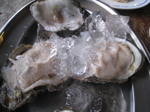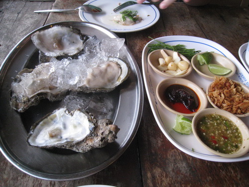 และแล้วอาหารก็มาถึง ..หอยนางรมย์สด ทานกับน้ำจิ้ม กระเทียม ยอดกระถิน บีบมะนาวนิด โอย