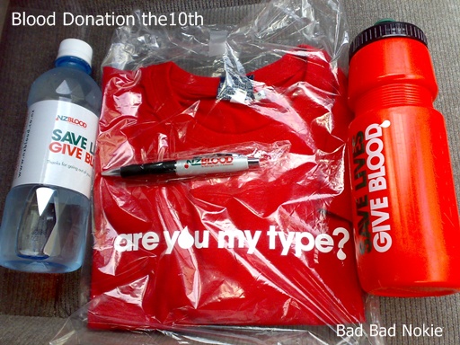 วันนี้ไปบริจาคเลือดมา เค้าก็บอกเราว่าครั้งที่10แล้ว อ๊ะ.. เผลอแป๊ปเดียวบริจาคไป 10ครั้งแล้ว และปีนี้ก็ครบรอบ10ปีของNZBlood พอบริจาคเสร็จคุณบุรุษพยาบาล คนที่เจาะให้เราก็เอาของขวัญมาให้เป็นเสื้อยืดสีแดงเขียนคำว่า "Are you my type?" ปากกา แล้วก็ขวดใส่น้ำมาให้ ประหลาดใจมากๆ ไม่คาดฝันมาก่อน ดีใจจัง