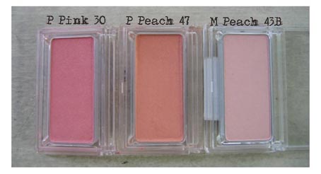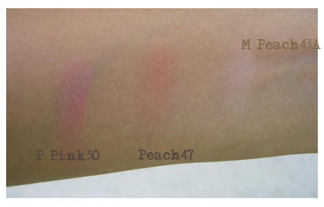 P Pink30 เป็นชมพูจ๋า สีเดียวที่เรามี ทีแรกก็คิดอยู่ว่ามันจะเวิร์กมั้ยว้า ผิวเราก็ออกจะเข้มปานนี้ แถมไม่ได้ลองอีกเพราะซื้อจากร้านเจ๊ตลาดนัด ปรากฏว่าถูกใจเลยค่ะ สีไม่ชมพูตุ๊กตาเกินไป ดูหวานสดใส แต่ถ้าจะปัดไปทำงานนี่ต้องแต่งตัวกระชากวัยตามไปด้วย...ฮ่า เหมาะกับวันลำลองมากกว่า P Peach47 เป็นบลัชชูอันแรกของเรา สีก็พีชน่ะค่ะ พีชชชชชชเลย มีวิ่งละเอียดมาก มองแทบไม่เห็น แต่มันช่วยกระจายแสงให้หน้าดูกระจ่างดี แล้วเจ้านี่เป็นสีสามัญประจำบ้านมากคือ ปัดได้ทุกโอกาสพอๆ กะน้อง MAC:Mocha เลย จริงๆ ตอนซื้อคุณบีเอเชียร์ M Peach40 มากกว่า แต่เราว่าปัดแล้วดูหน้าแมตต์ไป ไม่ต้องรสนิยมค่ะ M Peach43A อันนี้ซื้อตอนอารมณ์กำลังเซ็งสุดขีด อยากจ่ายตังค์ ตอนซื้อก็คิดอยู่นะว่าสีมันจางขนาดนี้แล้วจะปัดแล้วเห็นอะไรมั้ยนั่น แต่ด้วยความเครียดครอบงำเลยซื้อมาจนได้ เป็นความโชคดีที่สัญชาตญาณยังพอใช้ได้อยู่ เพราะเจ้านี่พอปัดทับหลายๆ ทีหน่อย จะได้แก้มอารมณ์นวลๆ คล้ายแก้มเด็ก แต่ไม่ออกสีชัด เหมือนไม่ได้ปัดน่ะค่ะ คนอื่นไม่รู้ว่าปัดแก้มแต่สงสัยว่าวันนี้หน้าผ่อง...ประมาณนั้น นอกจากนี้ยังใช้ไล้ใต้ตาให้ดูสว่างได้อีก นับว่าคุ้ม
