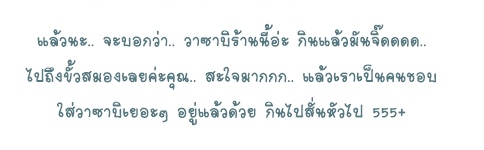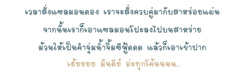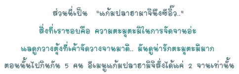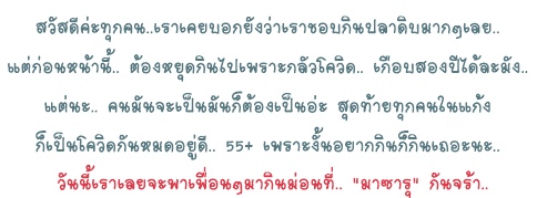 ได้ทานของอร่อยๆๆตั้งหลายอย่าง ซูซิ ที่เนี่ยแพงมากกไปทานบ่อยไม่ได้เดี่ยวเงินเดือนไม่ถึงสิ้นเดือน ฮ้าๆๆ แต่พูดเอาจริงๆๆนะ นัทก้อเหมือนคุณ ก๋า คือ ไม่กินของดิบ และไม่กินปลา ![]() มันเลยทำให้เสียเปรียบถ้าไปกินแบบ บุพเฟ่ อานะ แถมมิหน่ำซ้ำ แฟนนัท ไม่กินปลา และไม่กินสาหร่าย งานเนี่ยเลยไม่รู้จะไปกินรัยกัน ฮ้าๆๆ จากบล็อก ถ้าคุณ หนอนอยากเปลี่ยนอีโมติค่อน ก้อทำไม่ยากน๊า ลองดูจ้า ใช่เลยนัทว่าแต่งพอดูไม่เบื่อ แต่เปลี่ยนพื้นทุกครั้งเวลาอัพบล็อกเป็นใช้ได้แหละ เนาะ ![]() โดย: จอมแก่นแสนซน