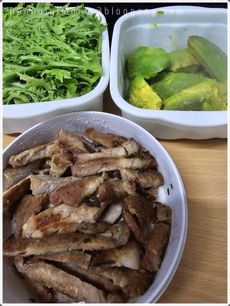 เอาใส่กล่องไปกินที่ออฟฟิต กินกับผักสลัดแตงกวา แล้วก็อาโวคาโด