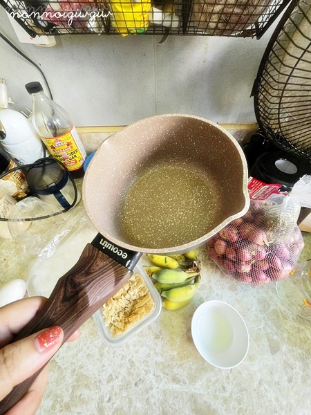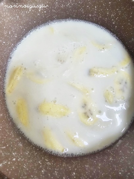 พอคนน้ำตาลเกลือให้ละลายแล้วก็ใส่กล้วยลงไป