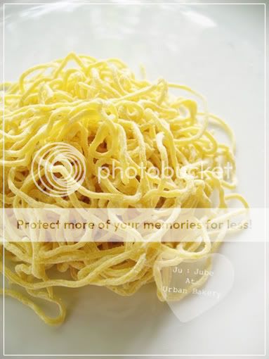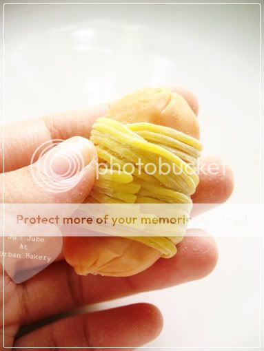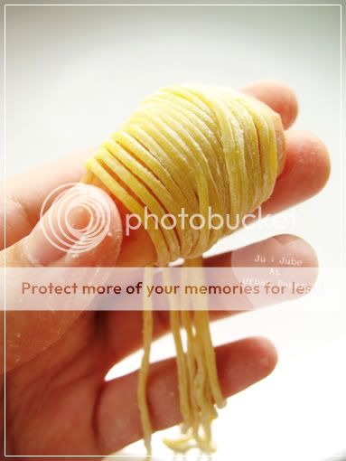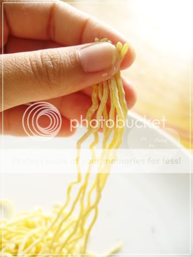 2. นำบะหมี่ออกมาจากห่อ 1 ก้อน คลายเส้นบะหมี่ออก พยายามเอาแป้งที่ติดอยู่ออกให้มากที่สุดนะคะ ***แล้วก็อย่าให้บะหมี่โดนลมค่ะ ไม่งั้นจะแห้ง พันแล้วขาดง่ายค่ะ