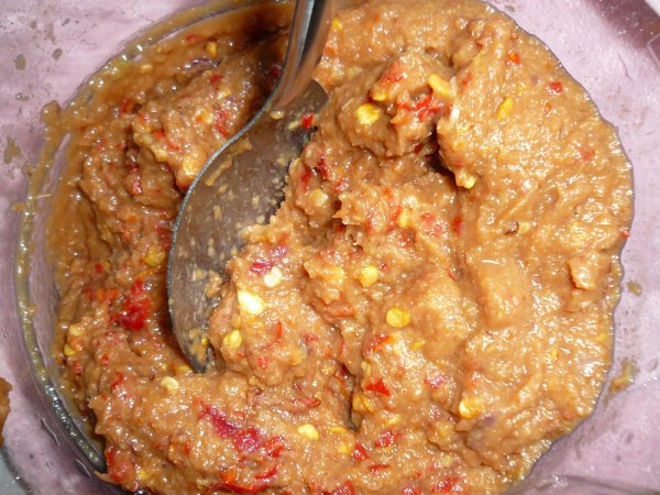เนี่ยล่ะน้ำพริกที่ปั่นได้ บางคนใส่ข่าด้วยนะคะแม่ก็ใส่ข่าแต่ใส่ไม่มากไม่งั้นต้มออกมาแล้วจะแปลก ๆ เลยตัดสินใจไม่ใส่ พอล้าง ๆ เครื่องแกงเสร็จก็เอาใส่เครื่อง food processor ปั่น ๆ ๆ ออกมาหน้าตาเป็นแบบเนี๊ย...